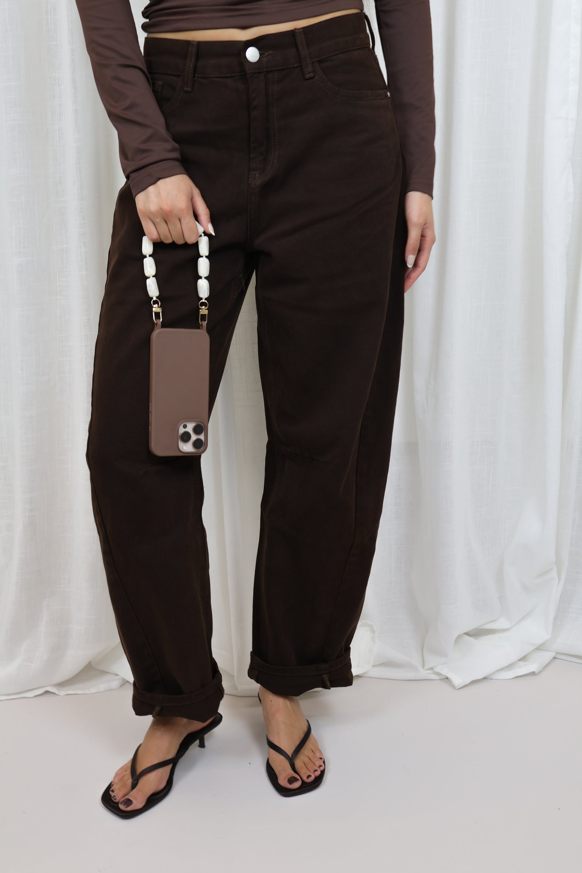 Een stoere jeans in een diepe bruine kleur met een moderne balloon fit. De iets lagere taille en het wijde model geven deze broek een trendy en comfortabele look. Perfect om casual te dragen met een T-shirt of te combineren met een elegante top.