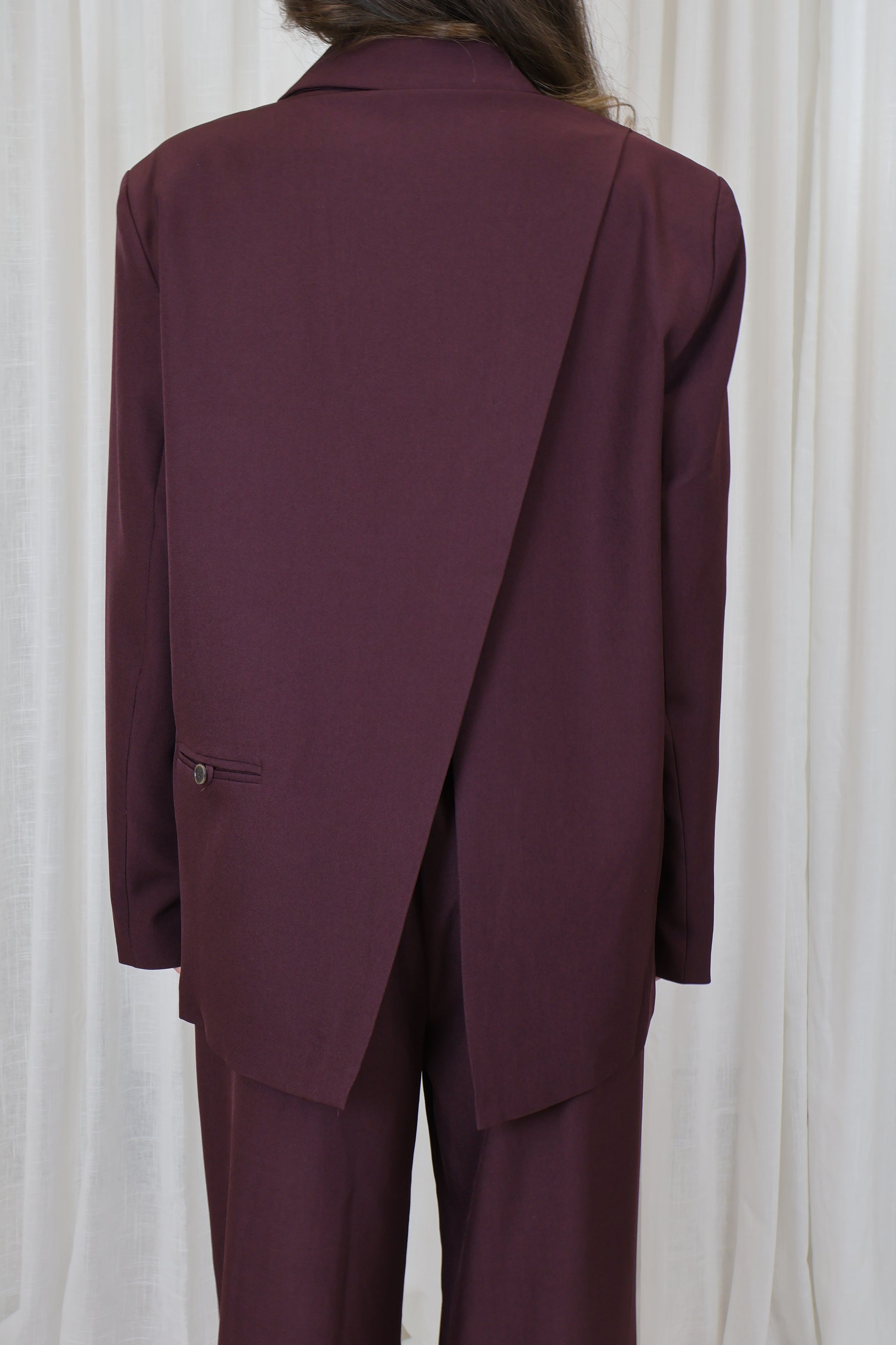 Deze oversized blazer in een diepe bordeaux tint is een echte eyecatcher met een moderne, vrouwelijke uitstraling. De relaxte fit en de grote split aan de achterkant geven het jasje een elegante, eigentijdse twist. Perfect te combineren met de bijpassende bordeaux pantalon voor een complete, stijlvolle co-ord look — of draag ‘m los over een basic top voor een effortless chic outfit.