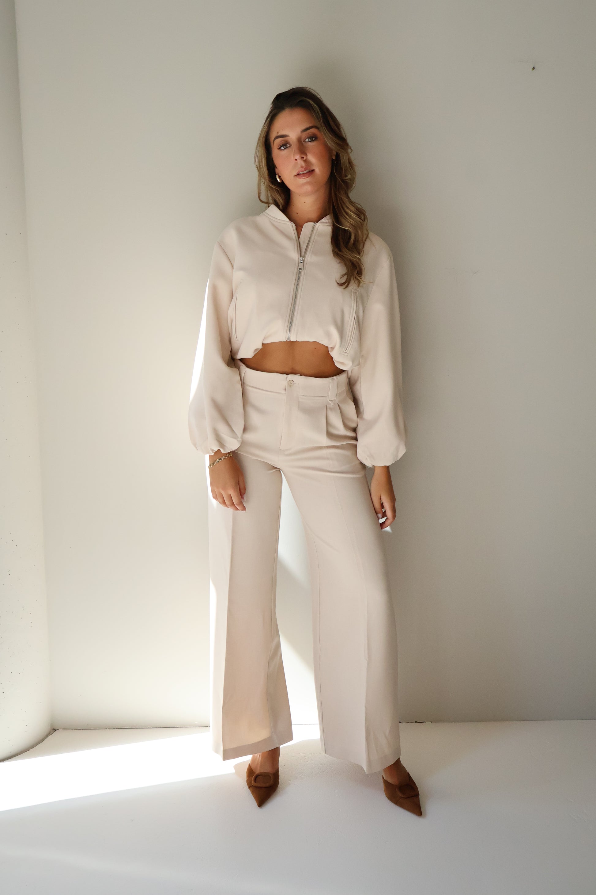 Een frisse variant op de klassieke bomber, uitgevoerd in een zachte crèmekleur. De cropped fit en ballonmouwen geven dit jasje een moderne uitstraling die zowel casual als chic te stylen is.