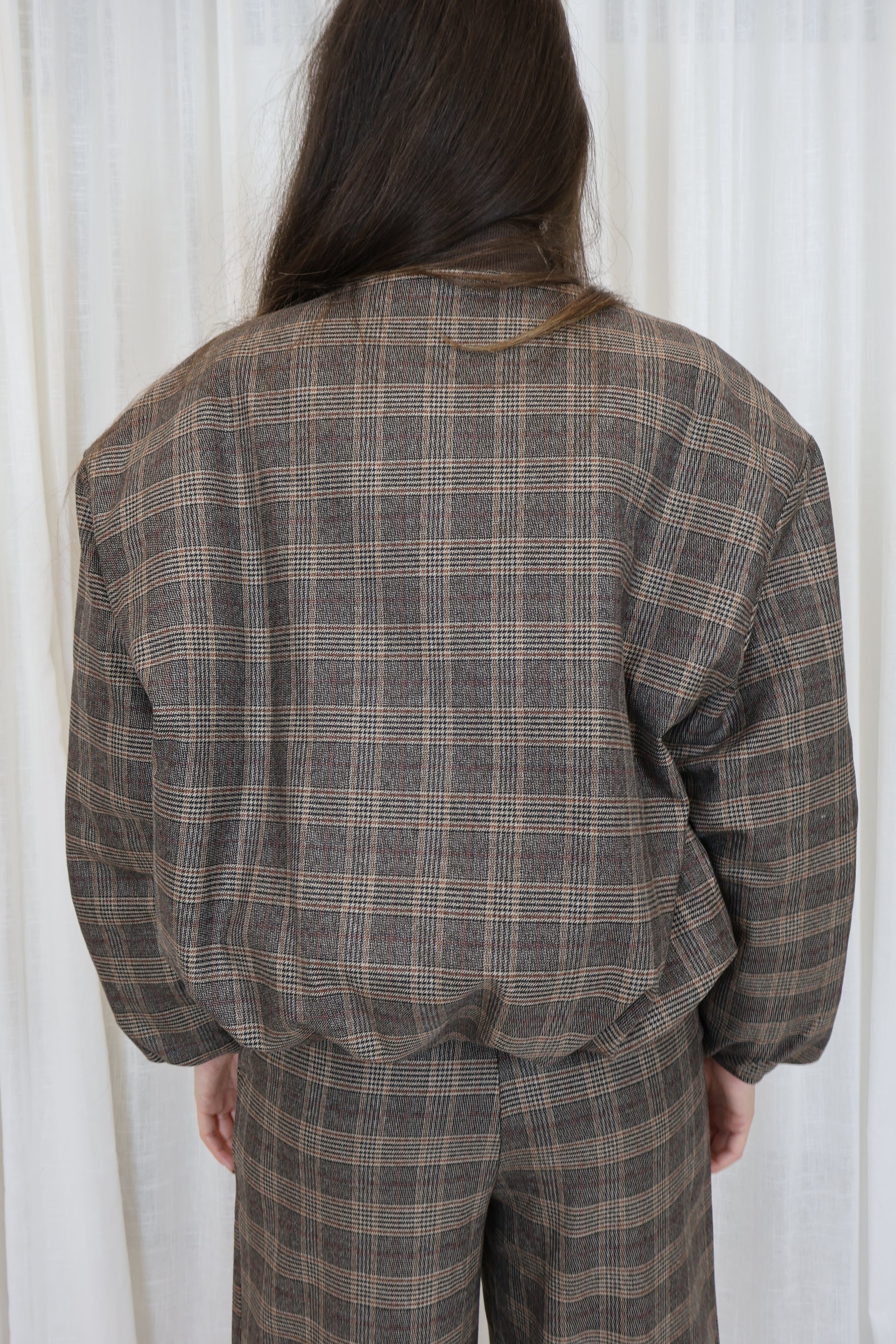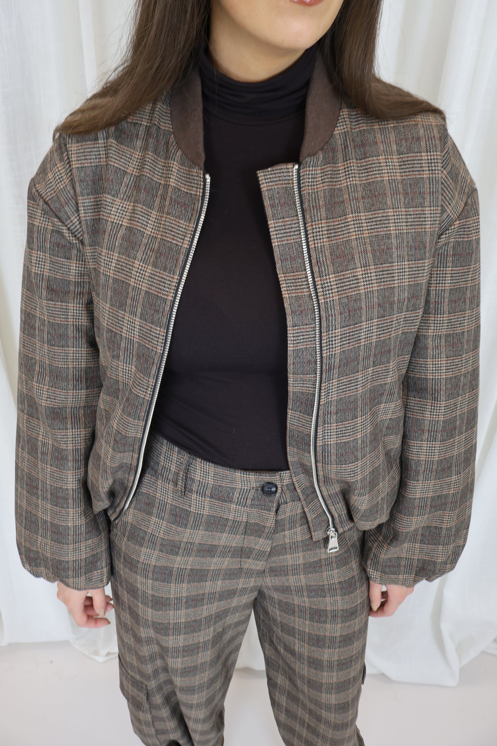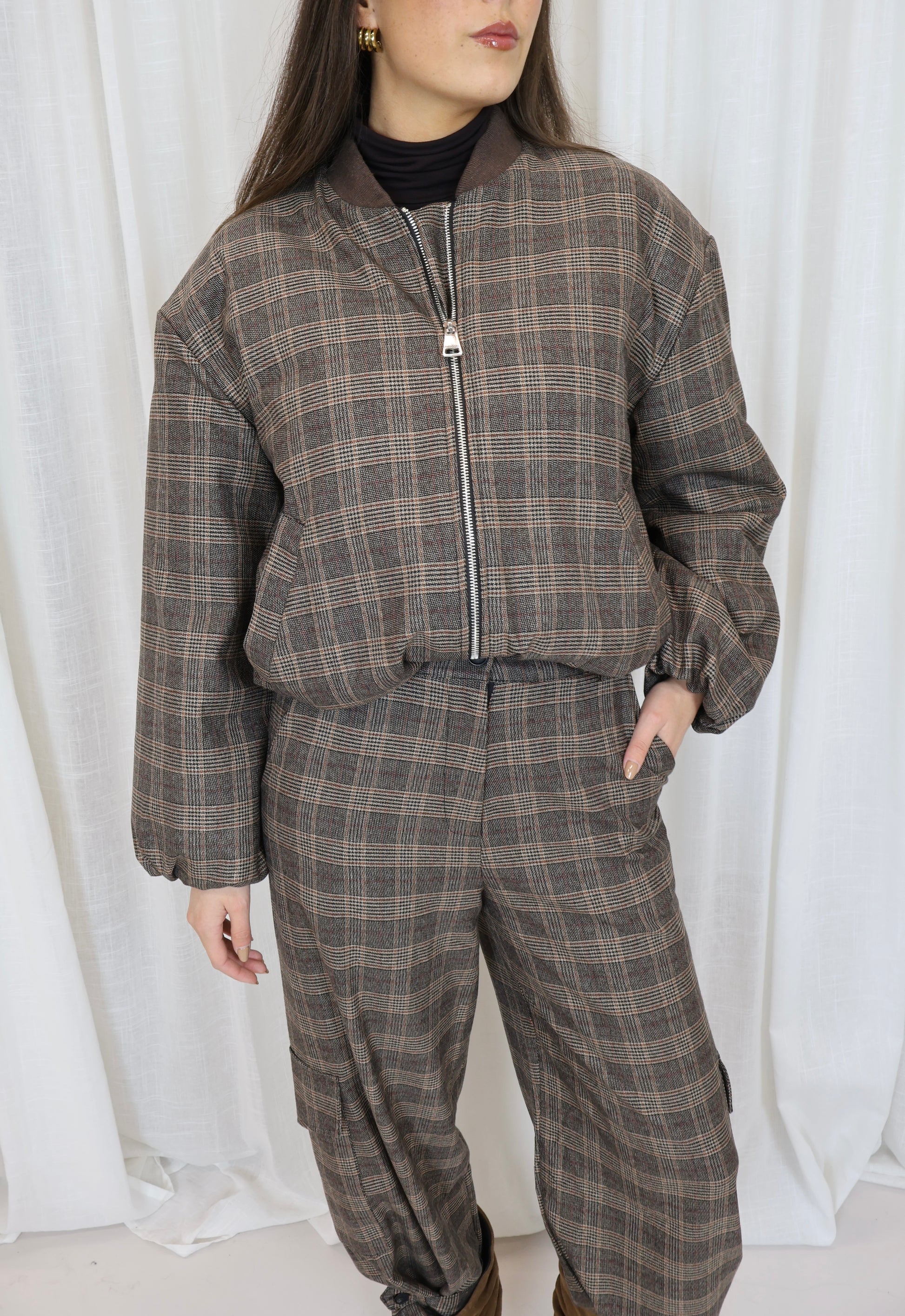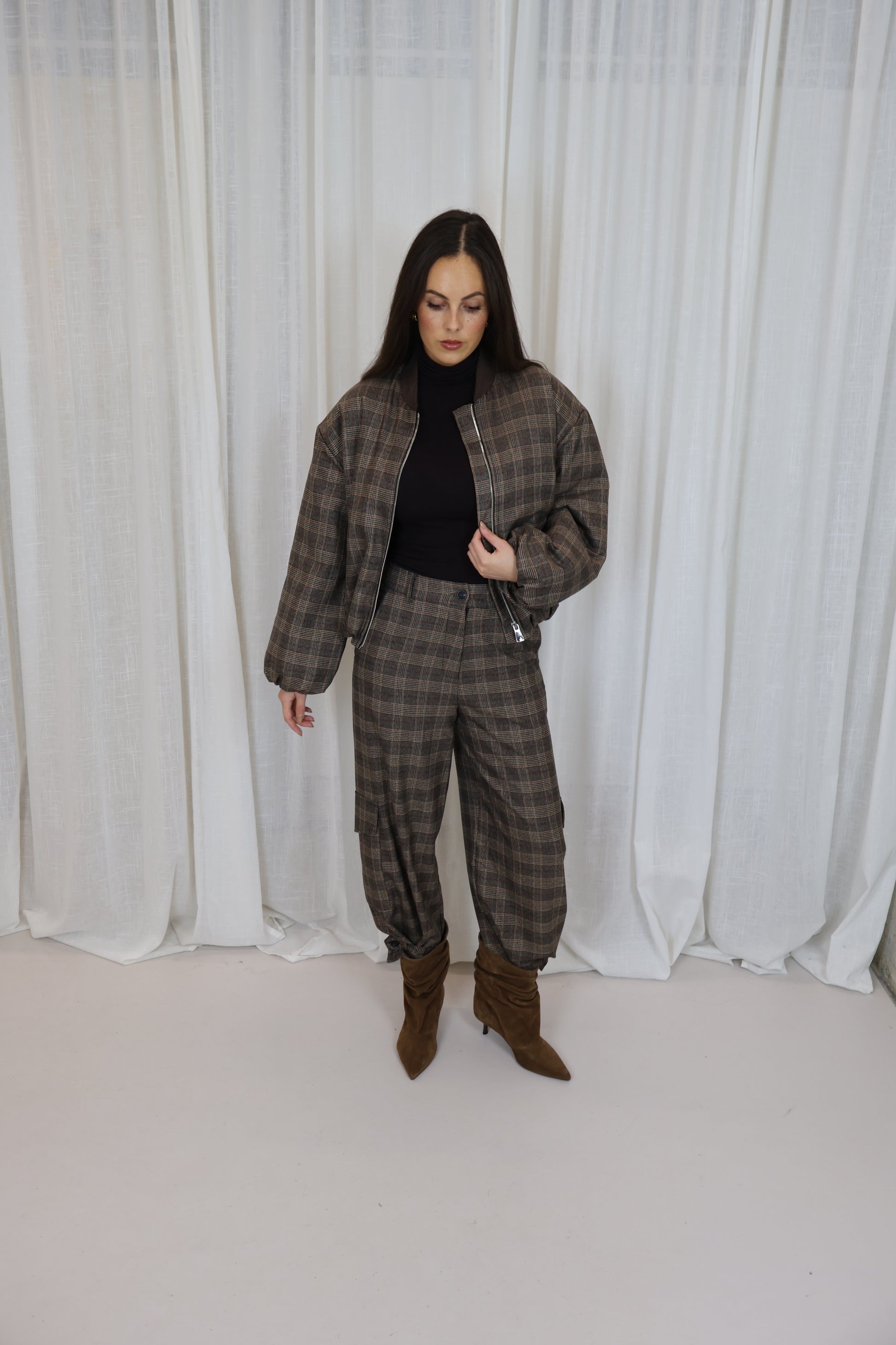 Dit bomberjasje in bruine ruit is het perfecte combinatie-item van stijl en comfort. Dankzij de warme, gevoerde binnenkant voelt het jasje stevig en cozy aan, ideaal voor de koudere dagen. Het model heeft een moderne bomberfit met een stretchband aan de onderkant, waardoor het jasje mooi aansluit en een trendy silhouet creëert. Een echte musthave — los te dragen of perfect te combineren met de bijpassende pantalon voor een complete look.