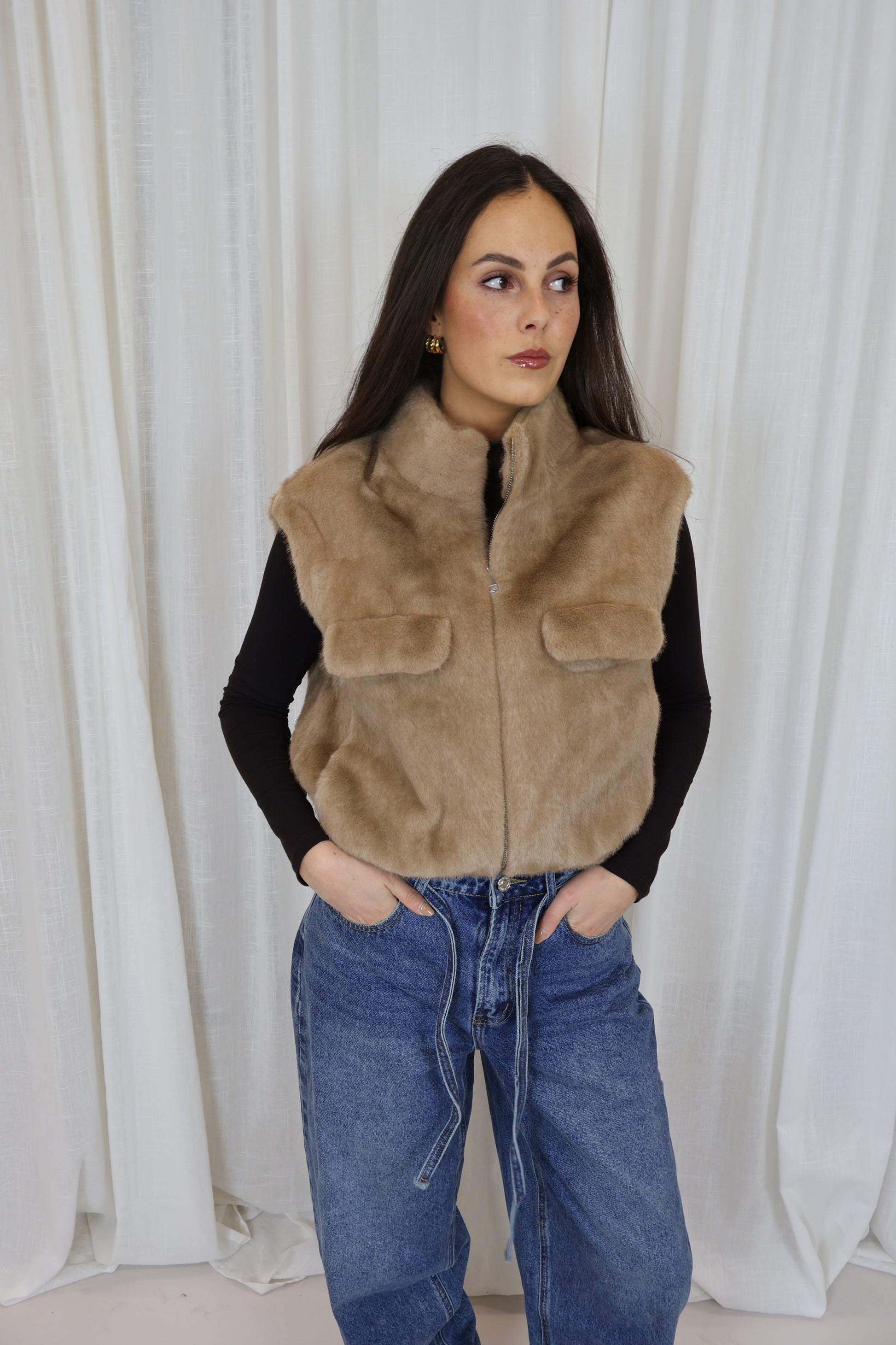 Dit beige fur gilet is een heerlijk zacht, harig jasje zonder mouwen dat elke outfit direct een warme, luxe uitstraling geeft. Het kraagje geeft een chique touch, terwijl de band aan de onderkant zorgt voor een mooie, licht aangesloten pasvorm. Ideaal om te dragen over een knit, blouse of longsleeve voor een cozy maar stijlvolle look.