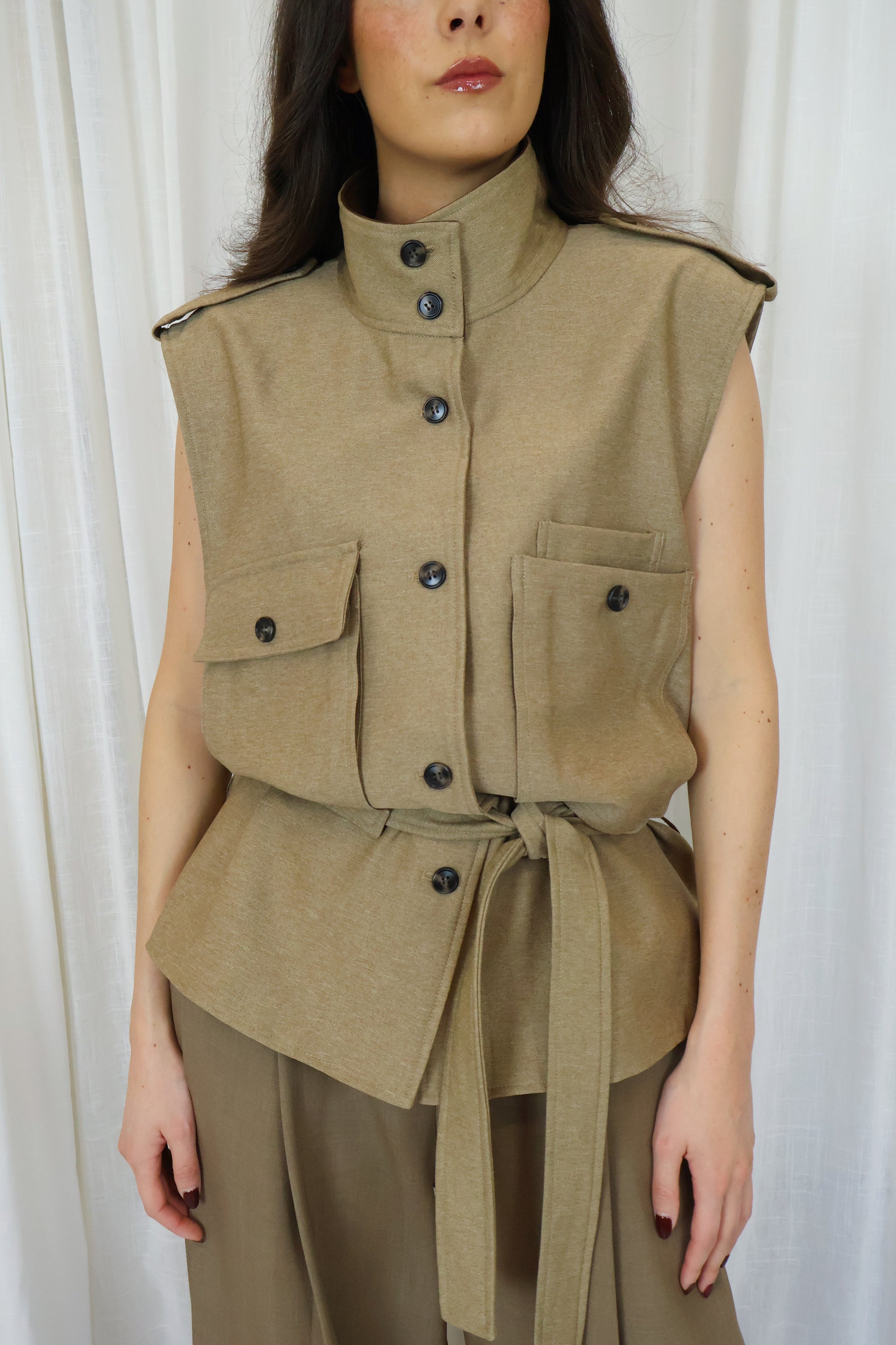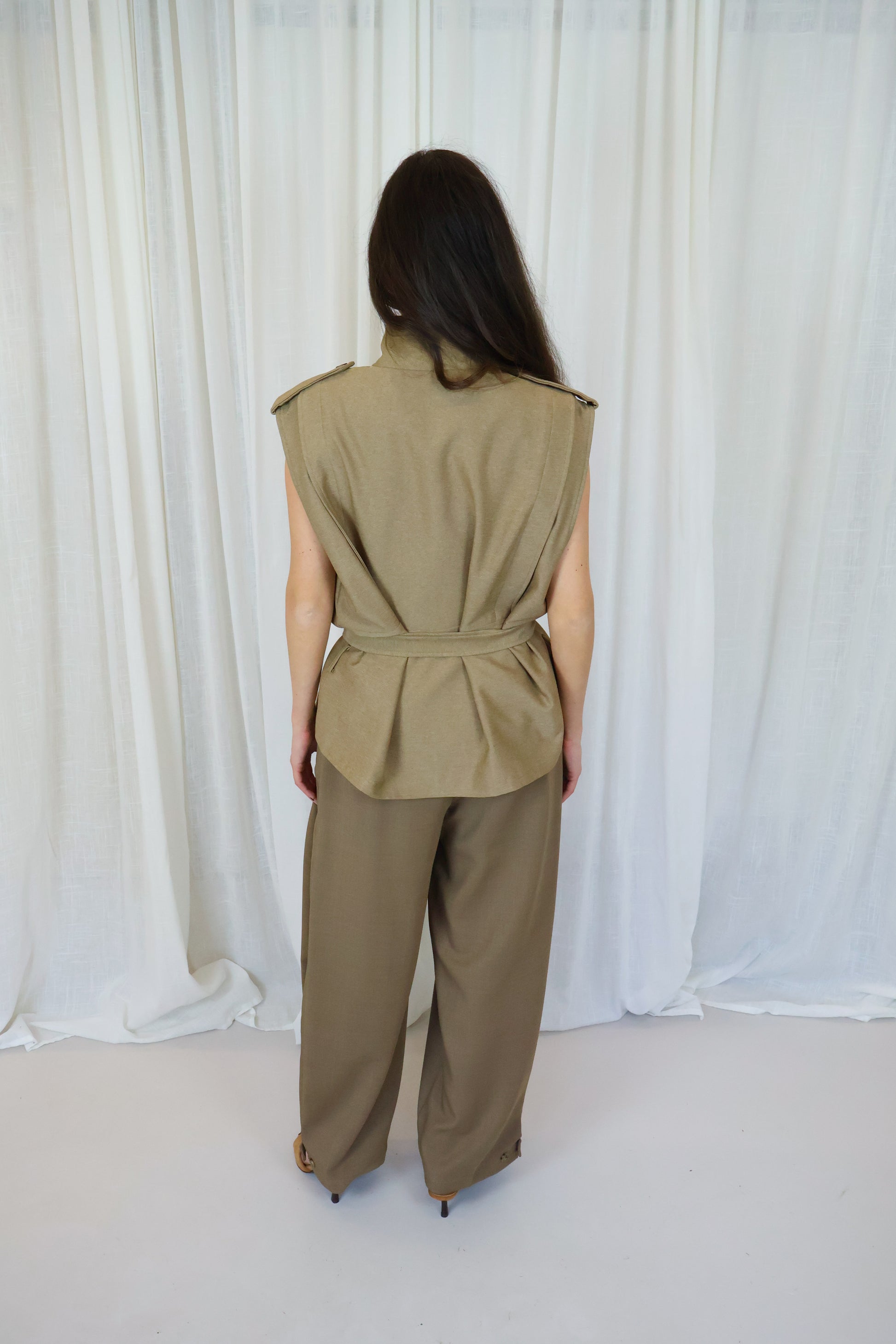 Dit camelkleurige gilet is een stijlvol statement item met een moderne, nonchalante uitstraling. De oversized fit geeft het gilet een eigentijdse look, terwijl de ceintuur in de taille zorgt voor de mogelijkheid om het silhouet vrouwelijk te accentueren. De combinatie van polyester en linnen zorgt voor een luchtige, comfortabele feel met een luxe uitstraling. Een bijzonder detail is de kraag met een subtiele bruine leren binnenzijde, wat het gilet net dat extra exclusieve accent geeft. Perfect om te dragen over een top of blouse, gecombineerd met een pantalon of jeans voor een krachtige, fashionable outfit.