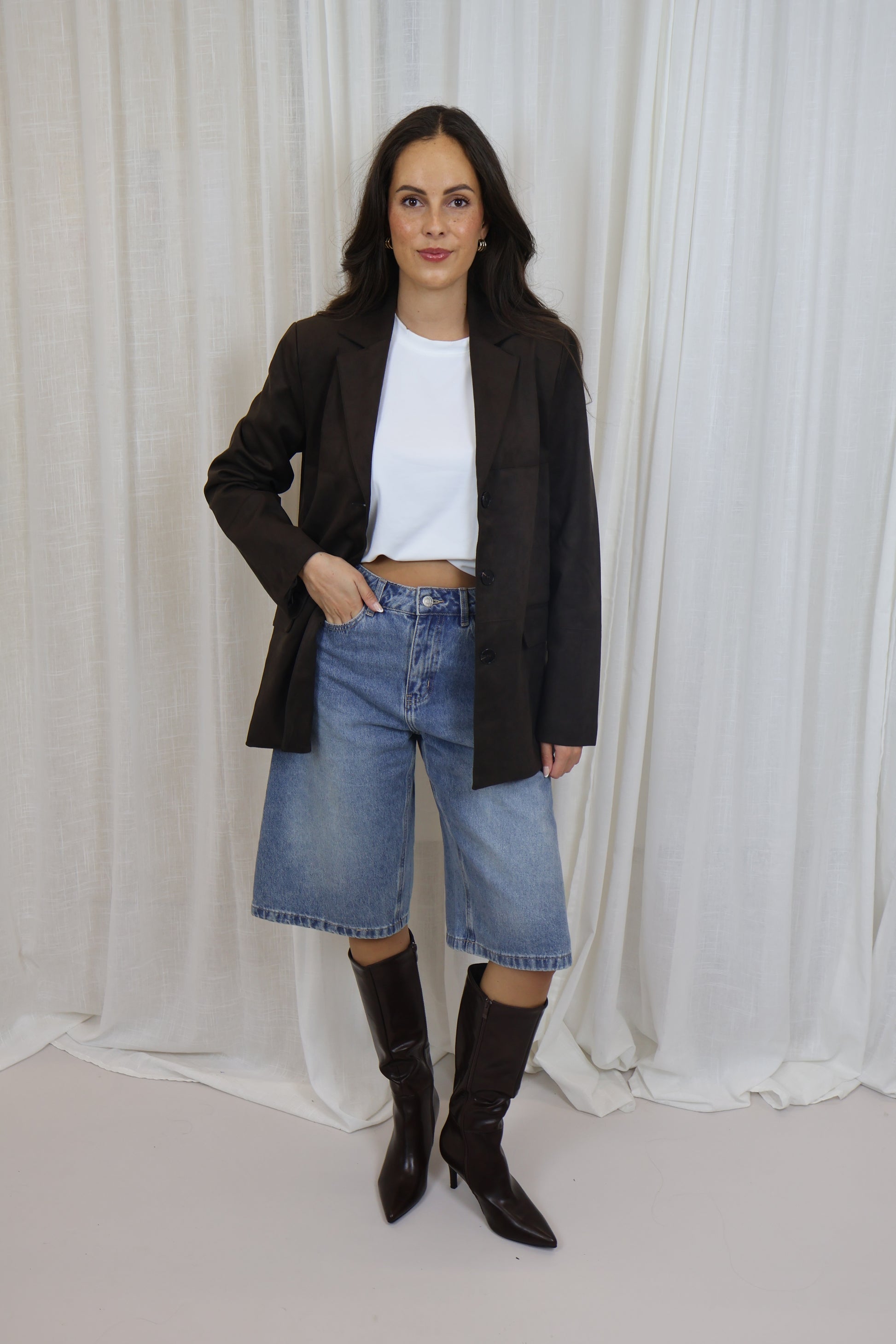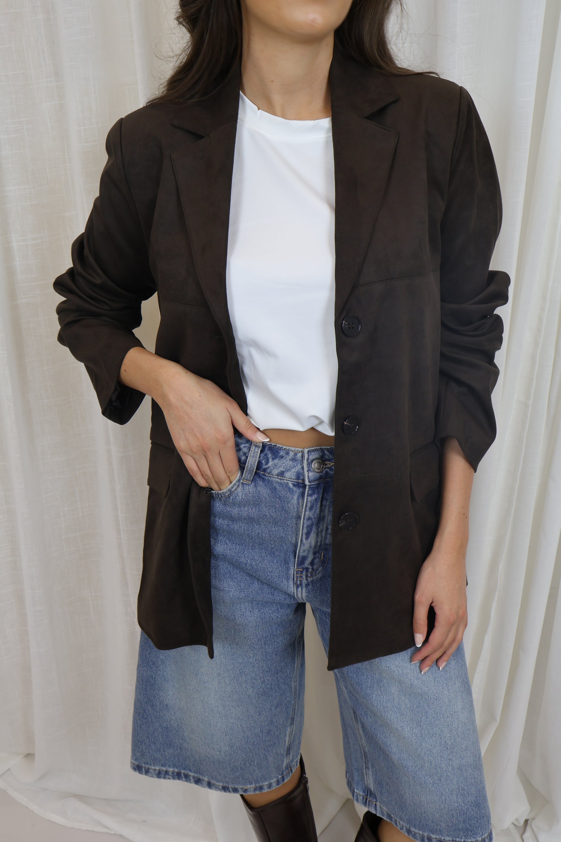 Een stijlvolle jas in donkerbruin suede look. Het rechte model en de zachte stof zorgen voor een tijdloze uitstraling die je zowel chic als casual kunt combineren. Een veelzijdig item dat niet mag ontbreken in je garderobe.