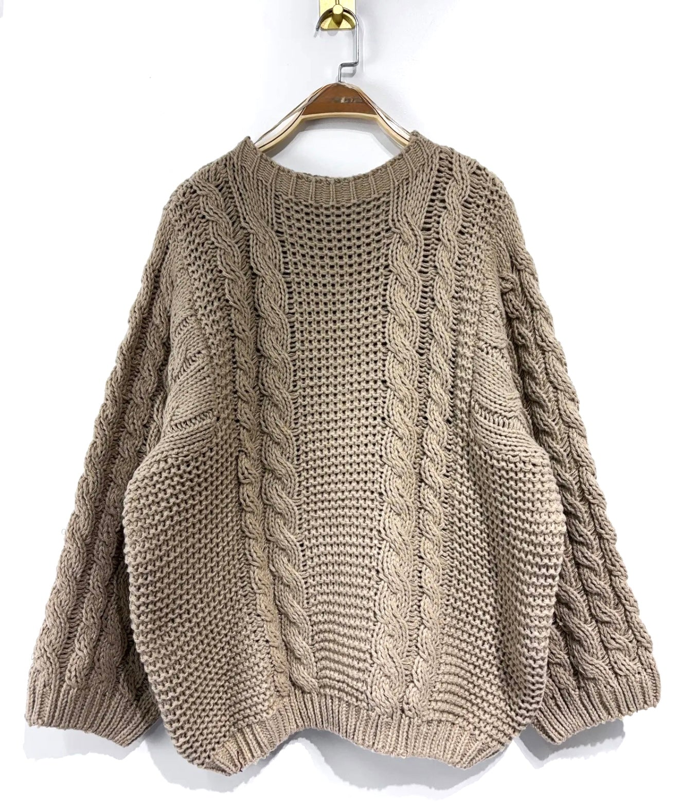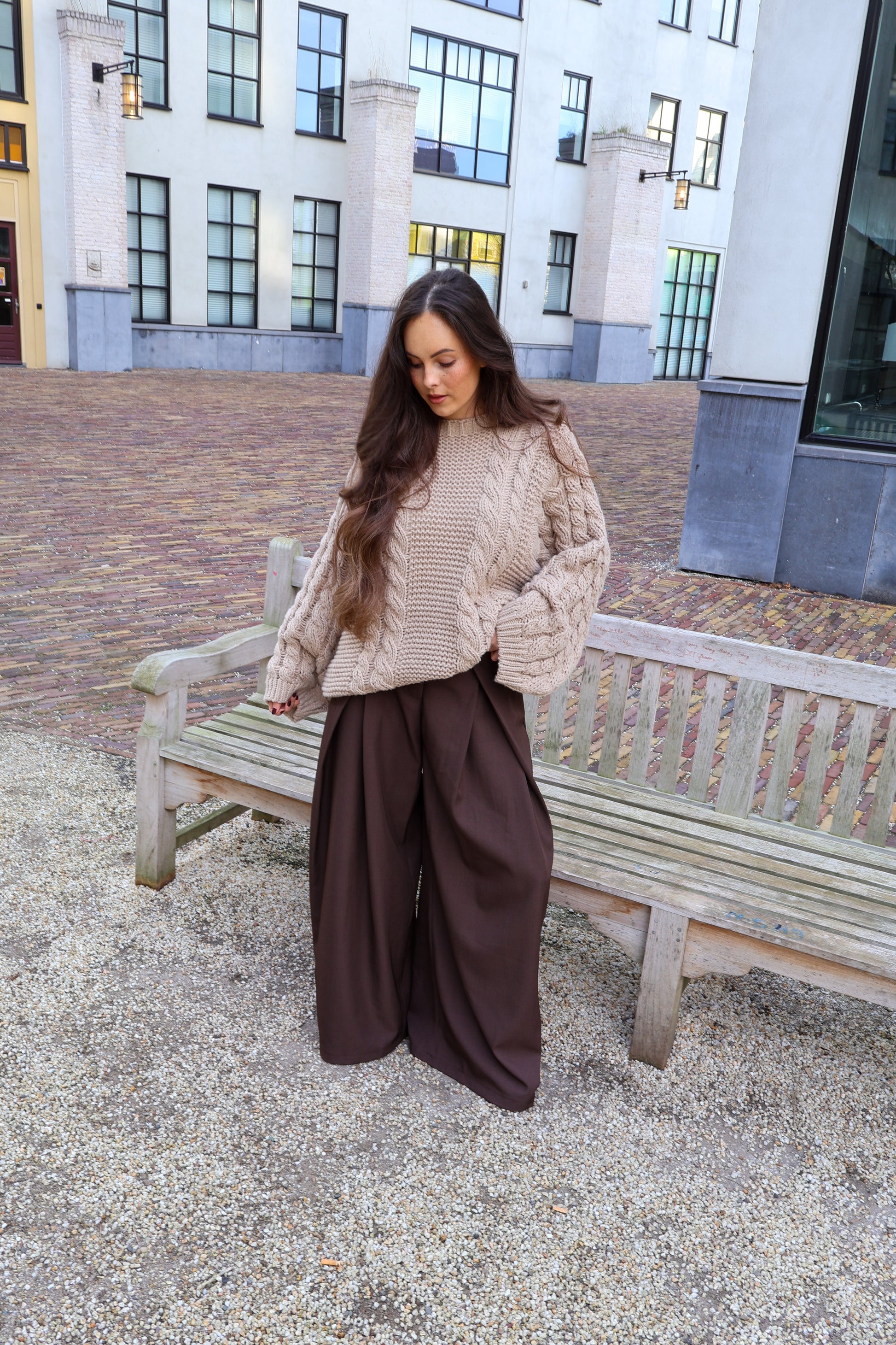Deze beigekleurige kabeltrui is een tijdloze essential met een warme en luxe uitstraling. De grofgebreide kabelstructuur geeft de trui een stijlvolle, klassieke look, terwijl de zachte kwaliteit zorgt voor optimaal draagcomfort. Dankzij de ruime one size fit is de trui mooi te dragen van maat S tot en met XL. Perfect om casual te combineren met een jeans, maar ook prachtig over een pantalon voor een cozy-chique outfit.
