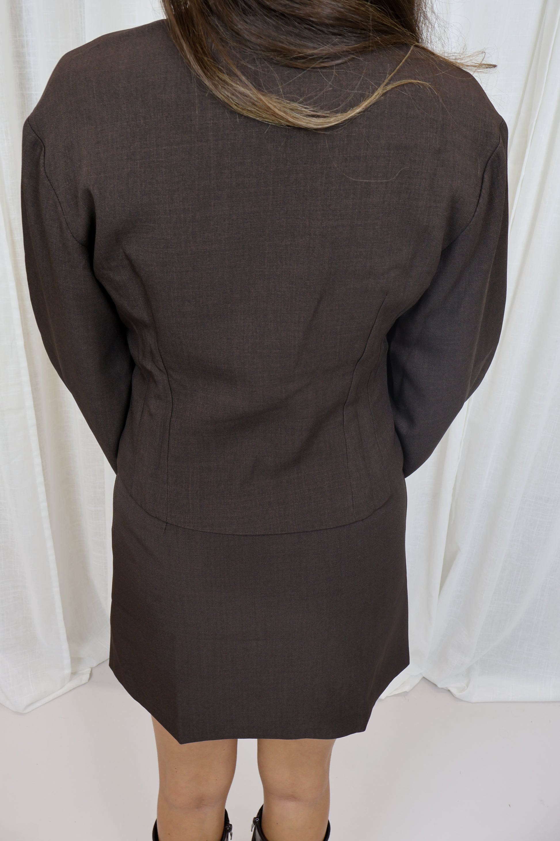 Een stijlvol setje bestaande uit een kort jasje met bijpassende rok. De diepe bruine kleur en de elegante snit maken dit een perfecte look voor zowel overdag als in de avond. Combineer het setje met laarzen of hakken voor een classy uitstraling.
