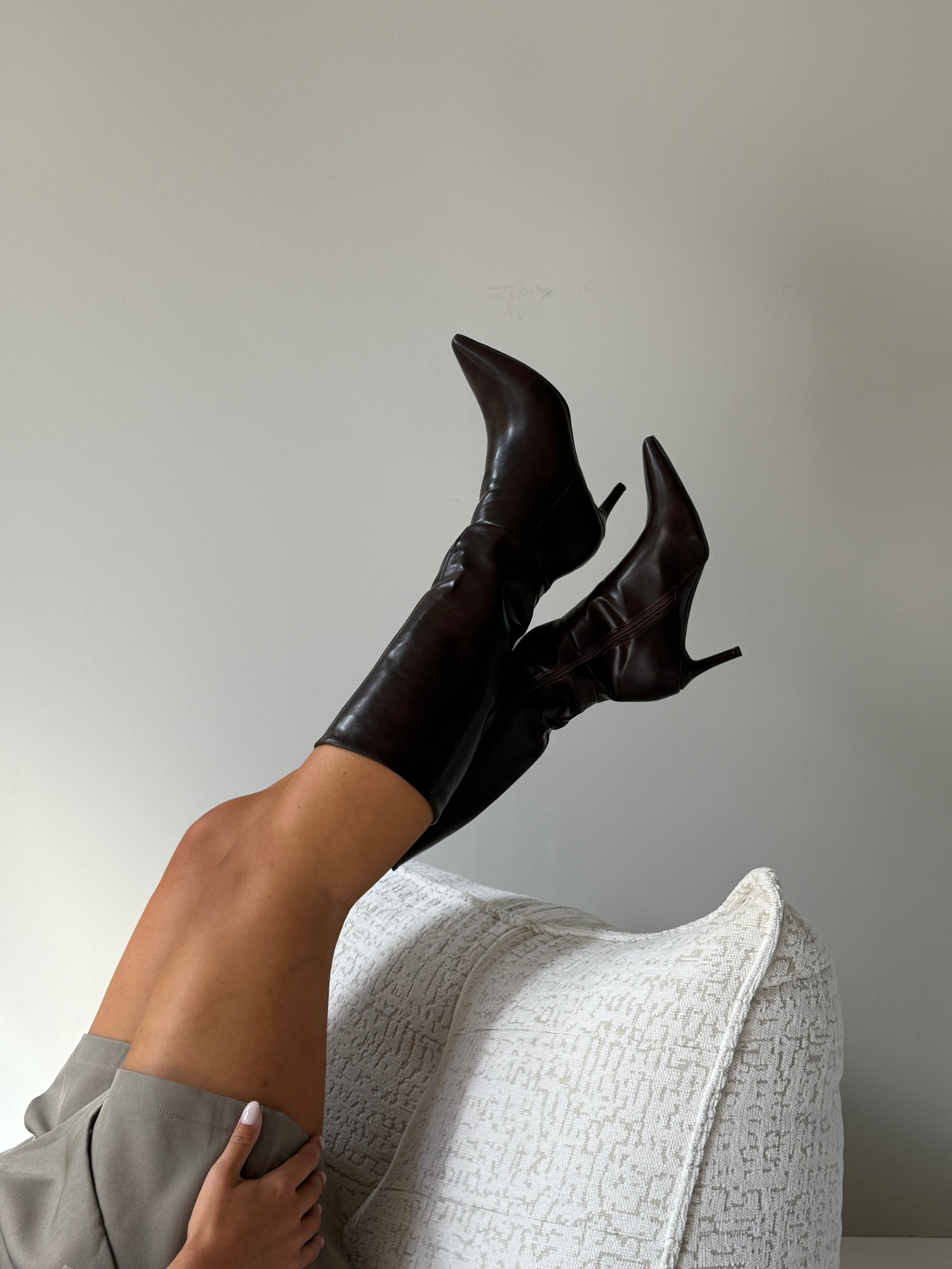 Deze donkerbruine laars is een echte klassieker die je eindeloos kunt combineren. Perfect onder een jurk of met een jeans voor een stijlvolle everyday look.