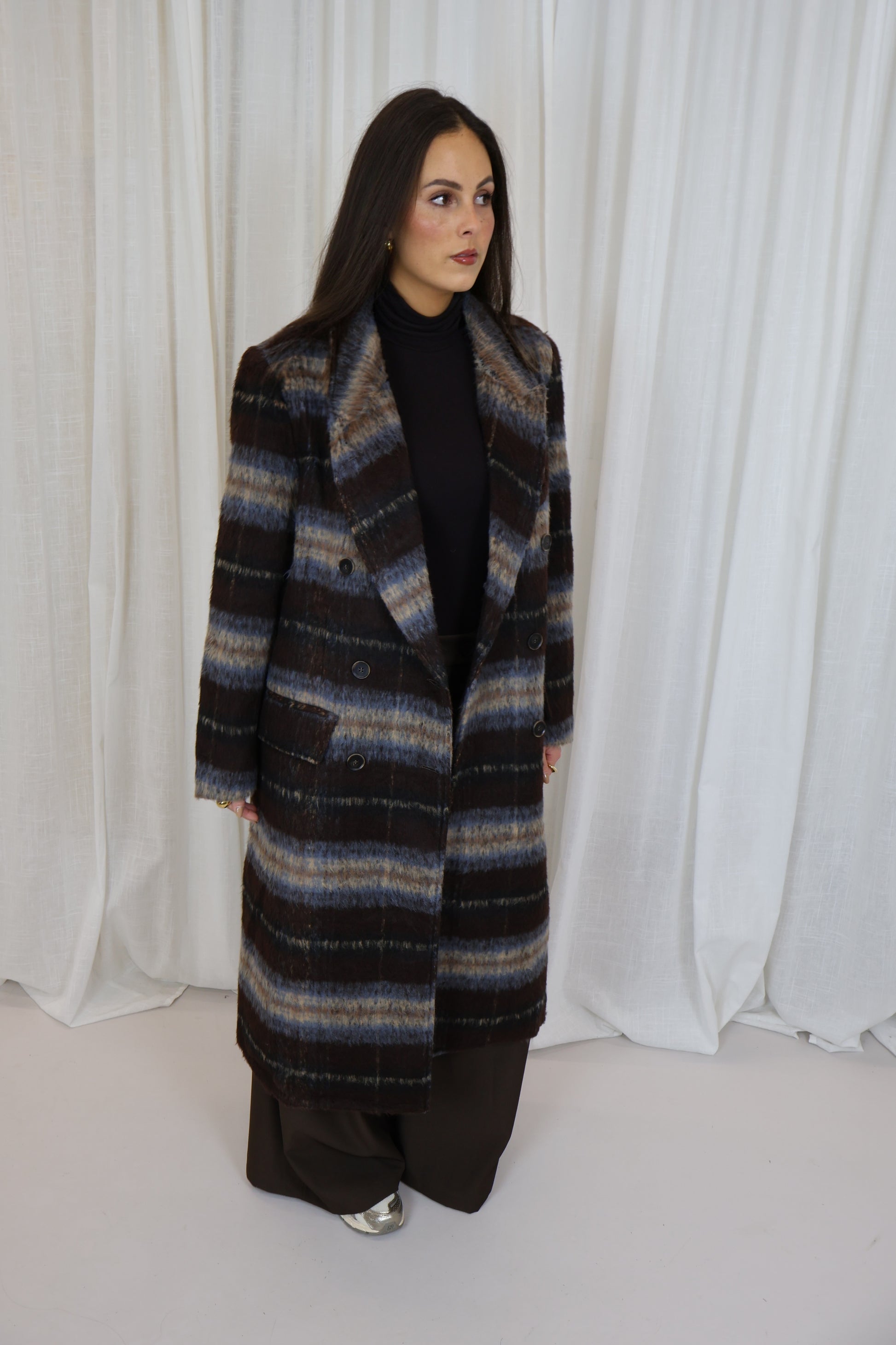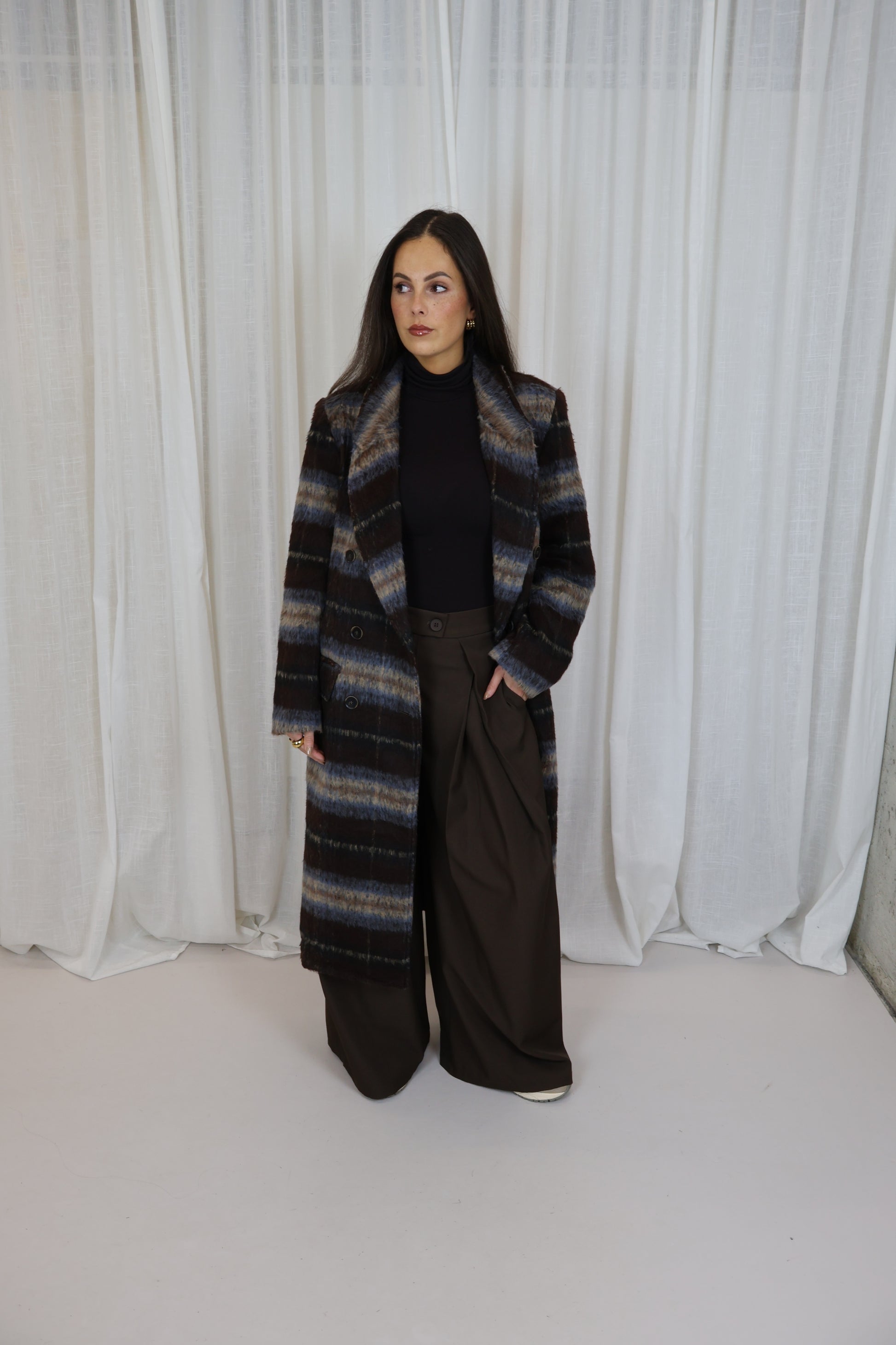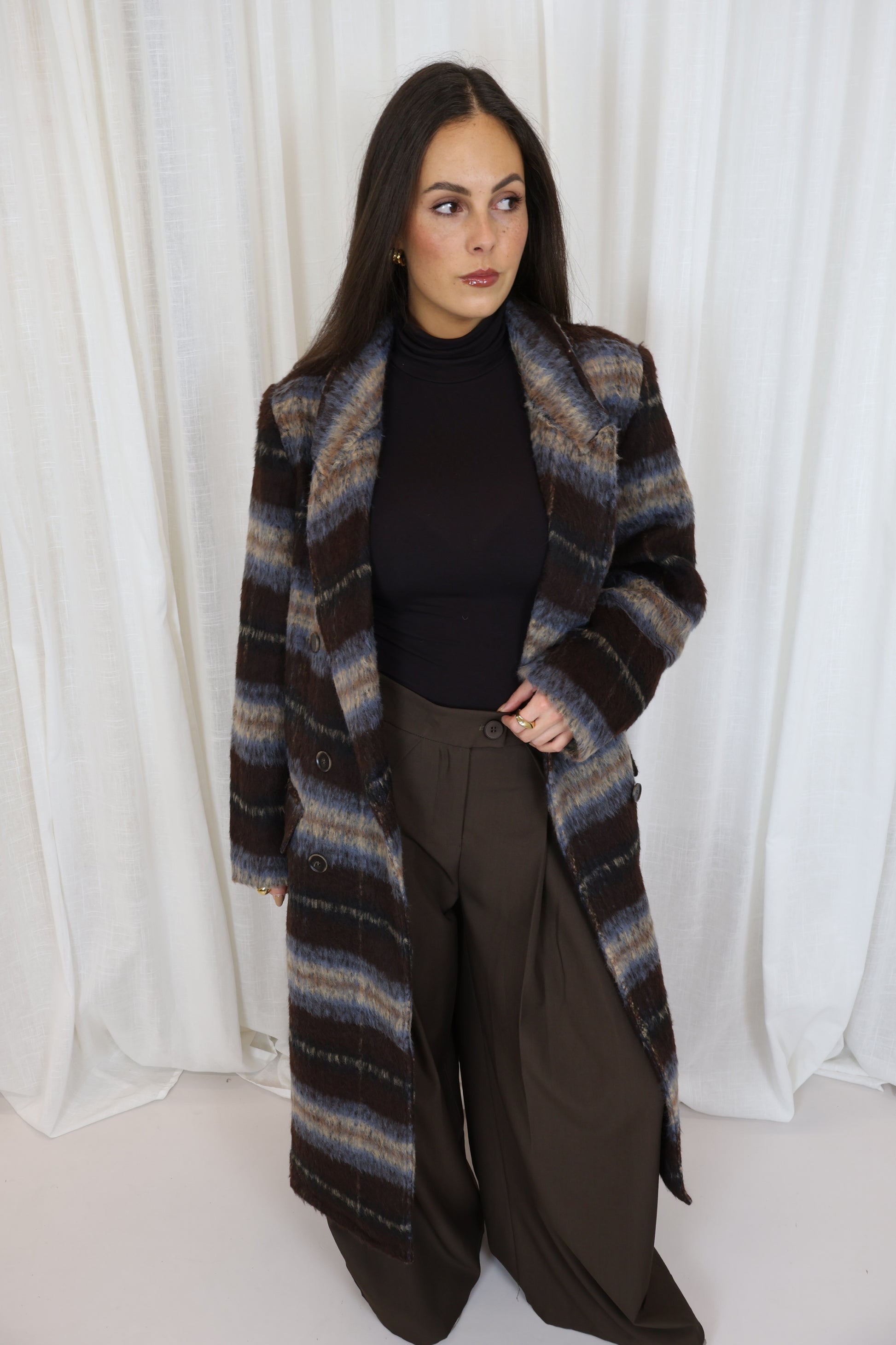 Deze oversized winterjas is een echte statement coat die warmte en stijl moeiteloos combineert. Het lange model en de rijke, meerkleurige strepen geven de jas een luxueuze en unieke uitstraling. De dikke, warme stof maakt dit de perfecte jas voor de koudste winterdagen. Dankzij de oversized fit valt hij ruim en comfortabel, ideaal om te dragen over truien en winterse laagjes.