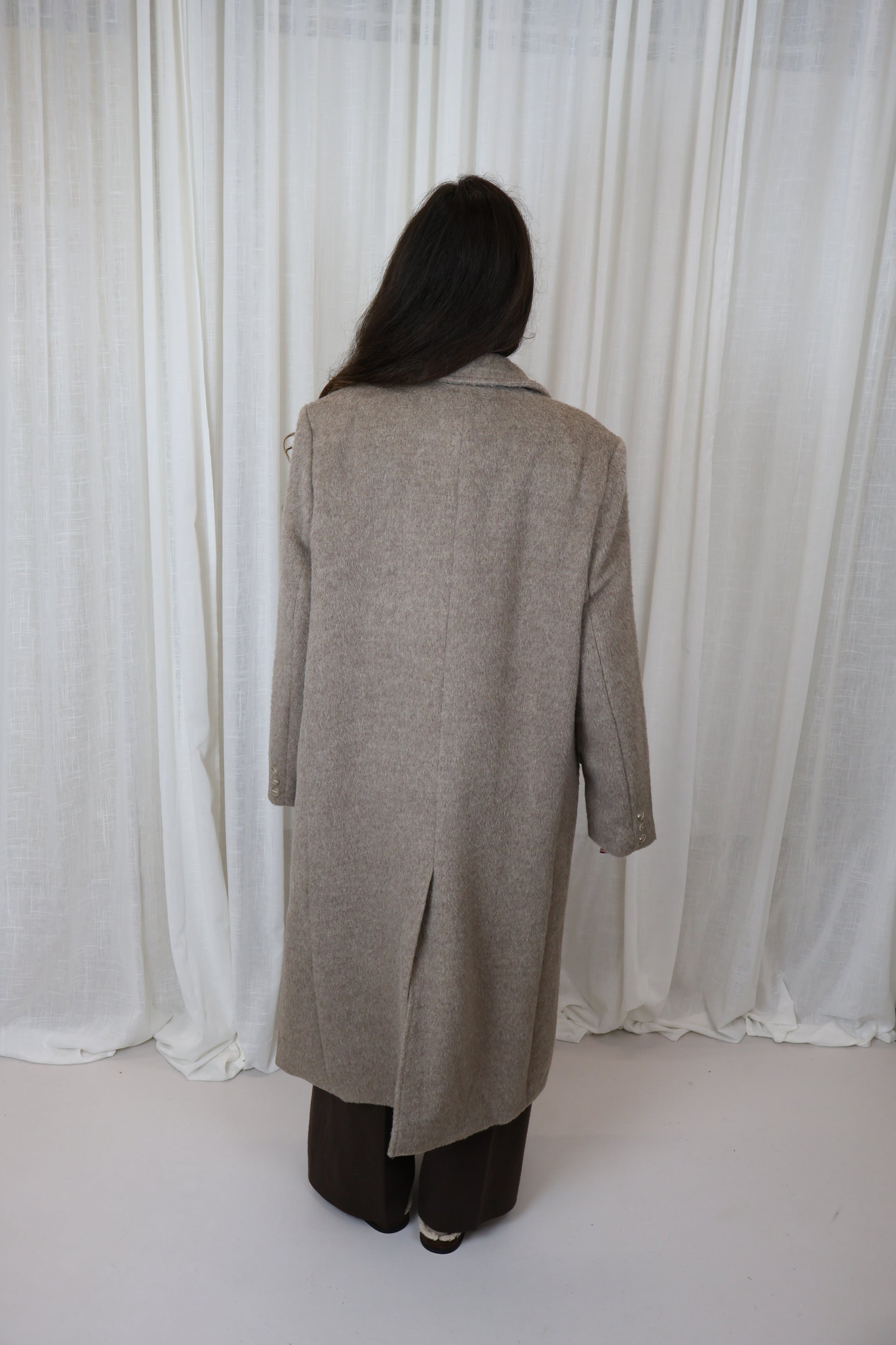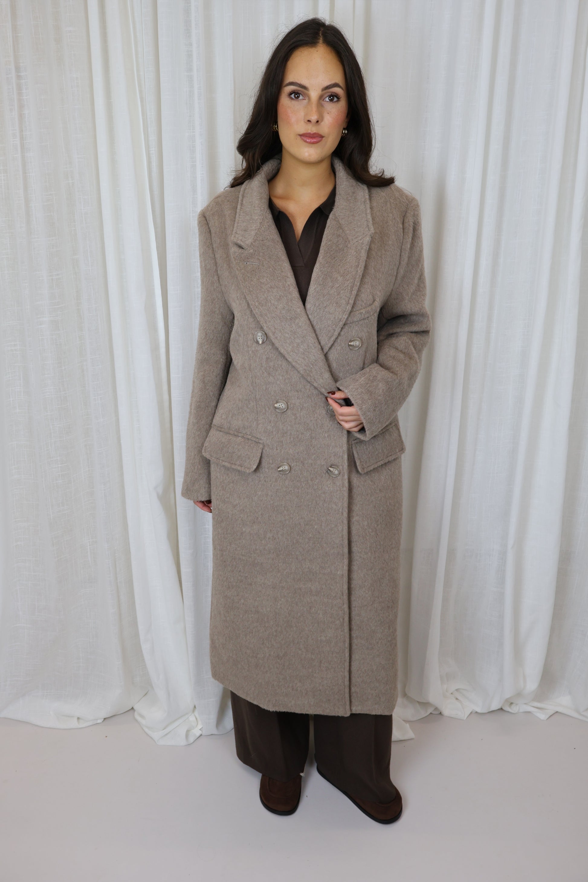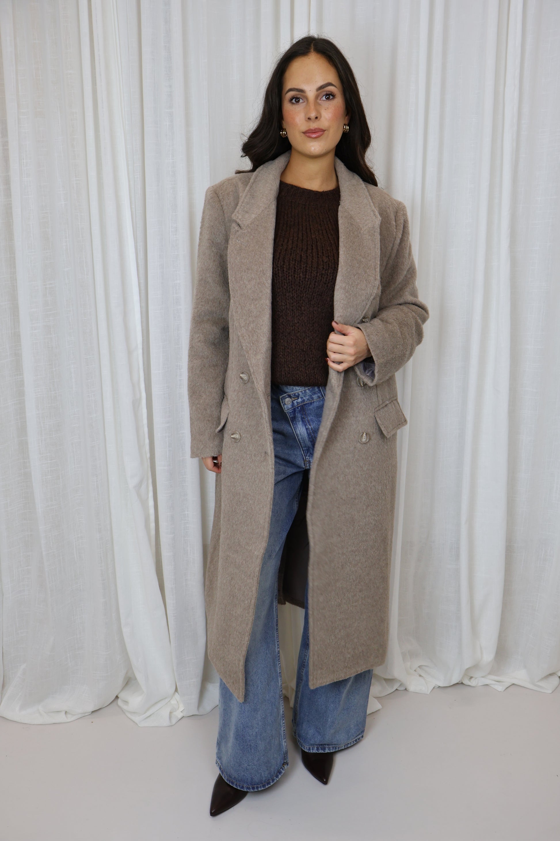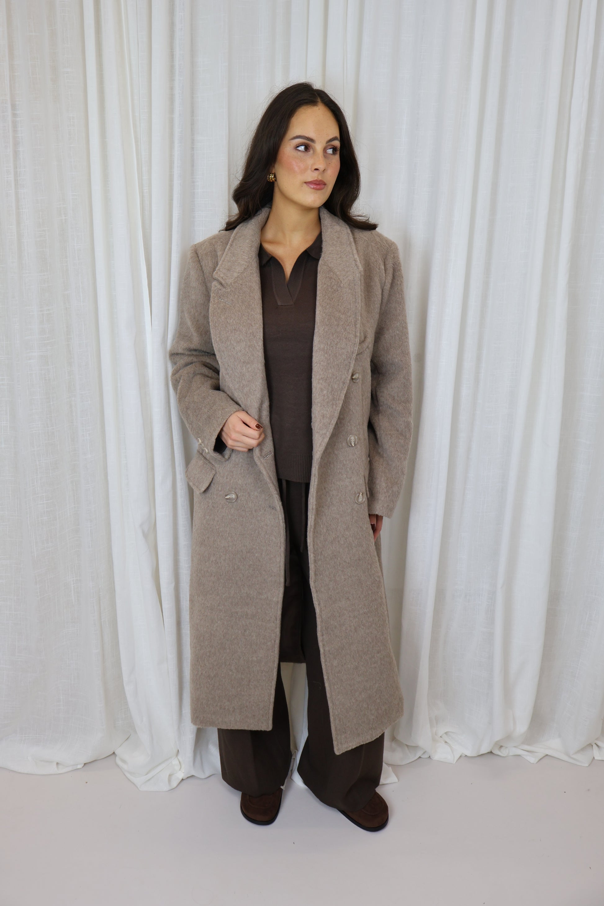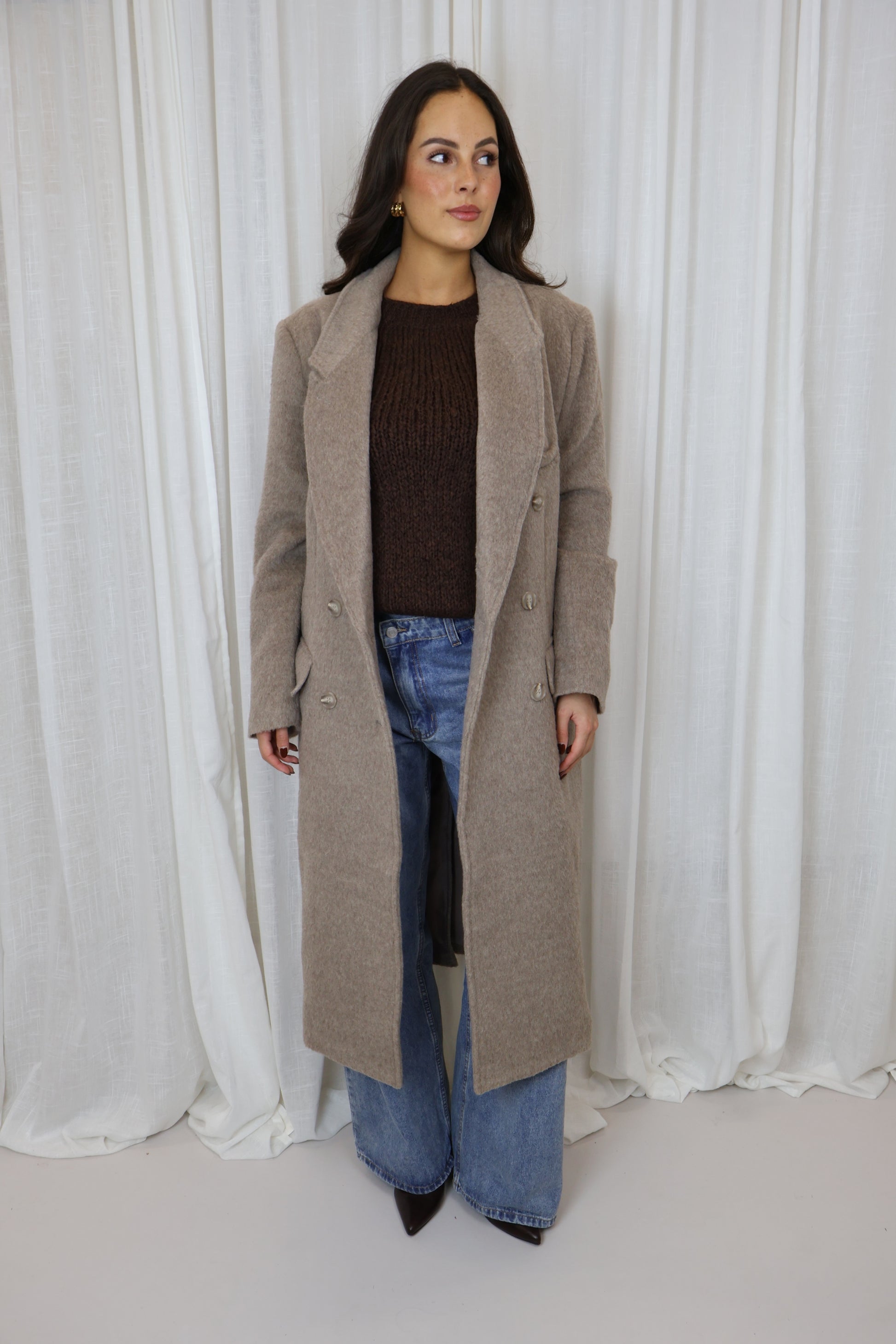 Deze lange manteljas in een zachte beige clair kleur straalt klassieke elegantie uit met een tijdloos, minimalistisch ontwerp. De jas heeft een rechte, comfortabele pasvorm met een lage kraag en een open hals, die je makkelijk sluit met de subtiele knopen aan de voorkant. Gemaakt van een zachte, stevige stof die je heerlijk warm houdt tijdens koelere dagen. Perfect voor zowel casual als meer geklede looks.