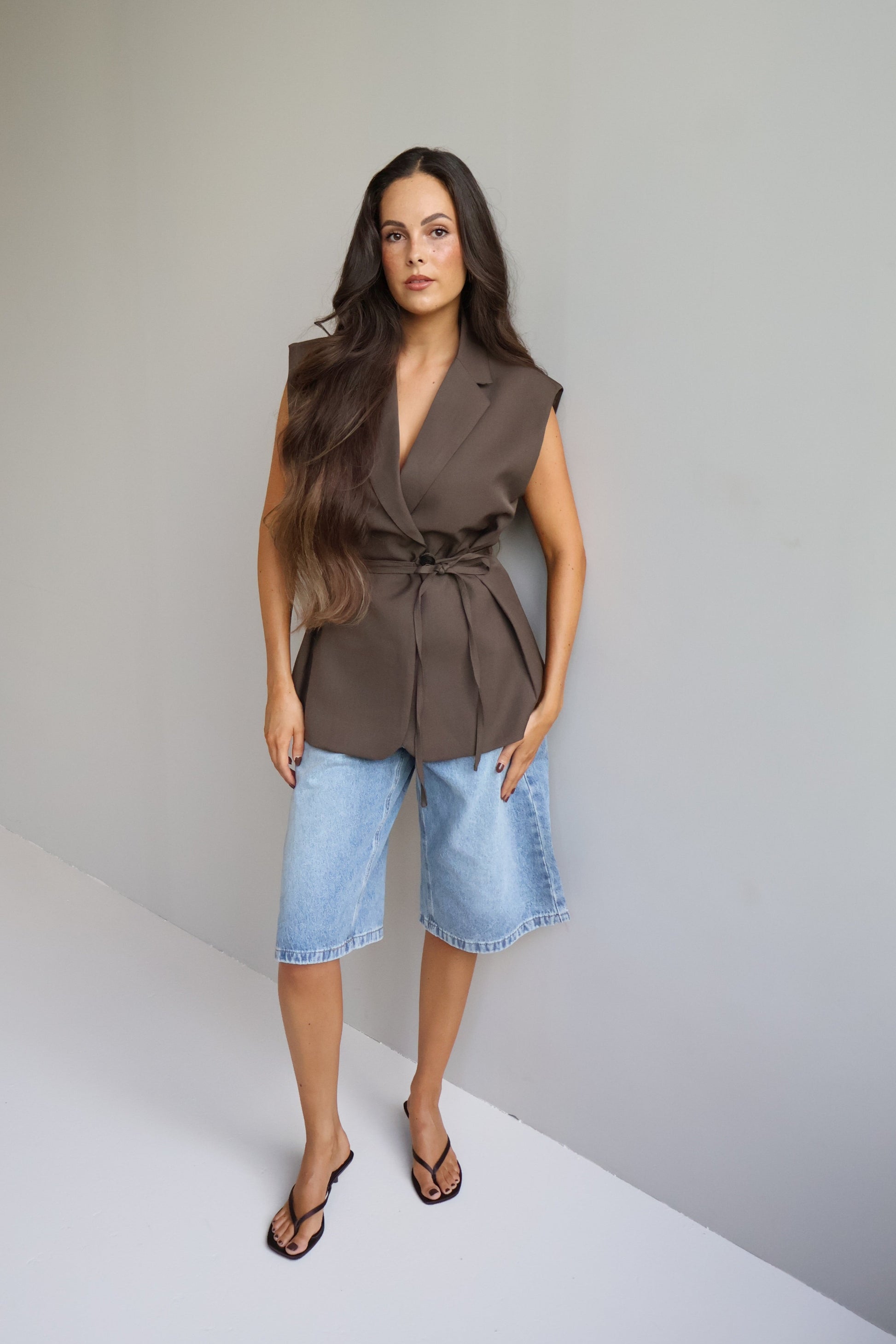 Een tijdloze mouwloze gilet in een diepe bruine kleur. Perfect te combineren voor zowel een casual als een zakelijke look. De ceintuur in de taille zorgt voor een elegante pasvorm.