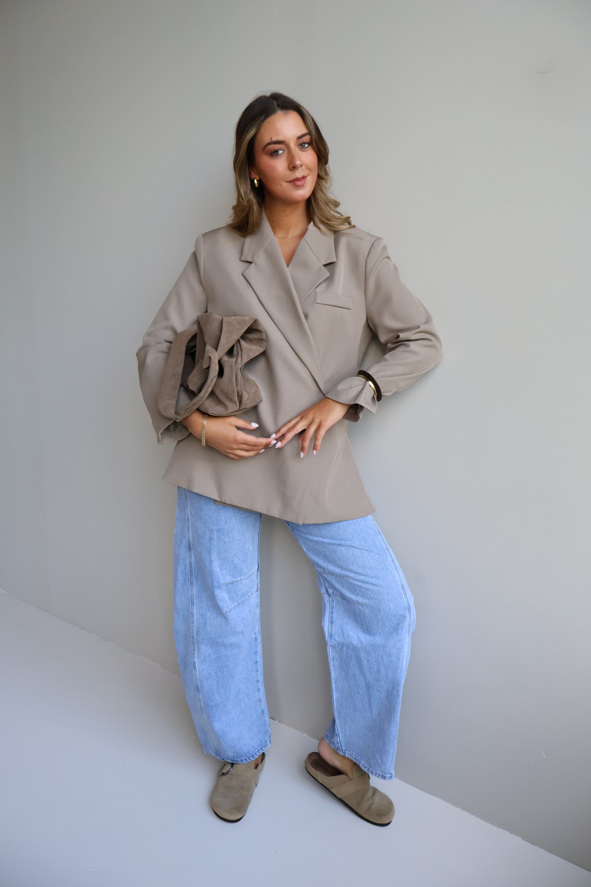 Een tijdloze blazer in taupe met een oversized fit. Perfect te combineren met denim voor een casual look of met de bijpassende pantalon of short voor een complete suit look.