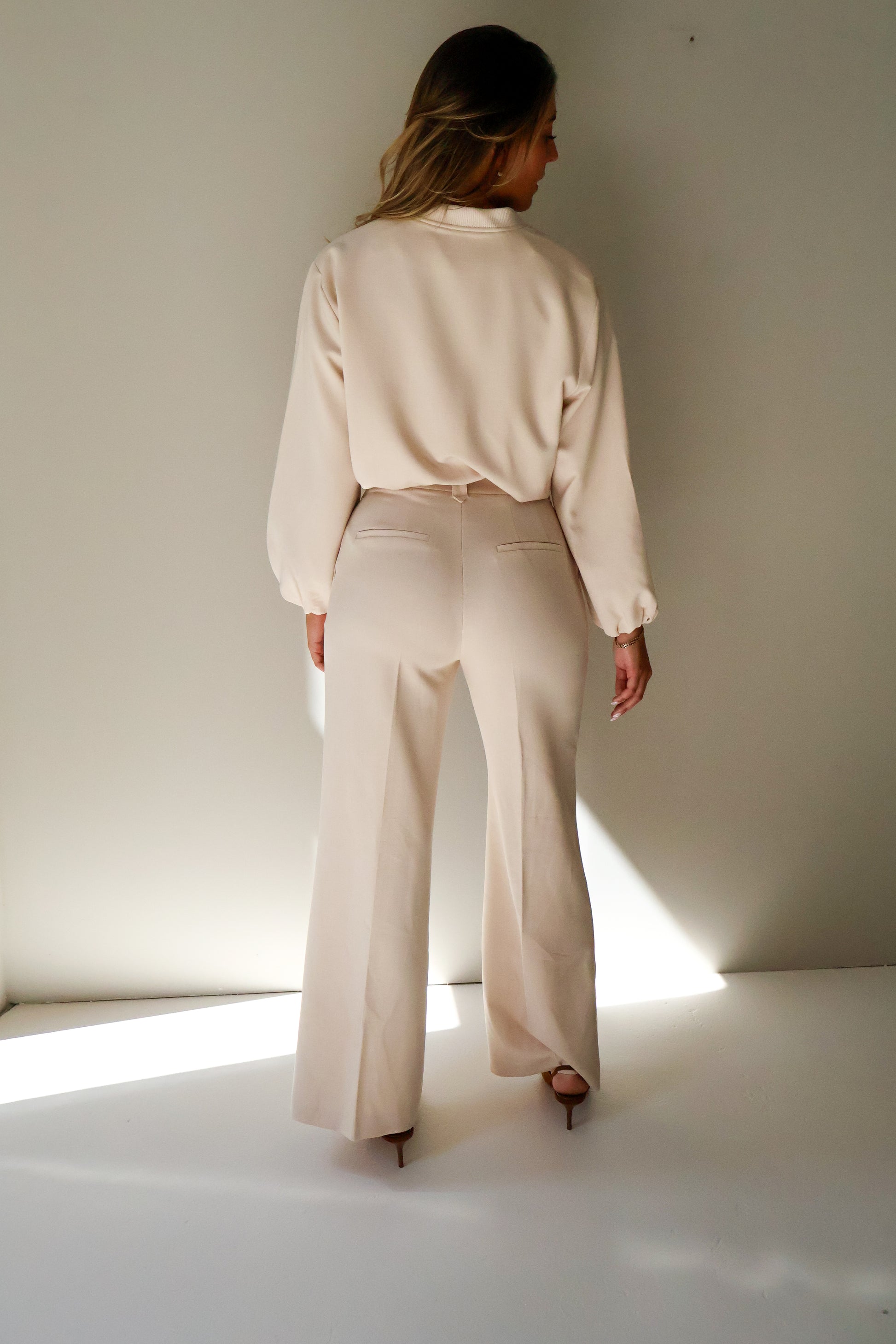 Een elegante pantalon in een zachte crèmekleur. Dankzij de wijde pijpen en het vloeiende materiaal straalt deze broek comfort en stijl uit. Perfect te combineren met bijpassende bomber jasje.