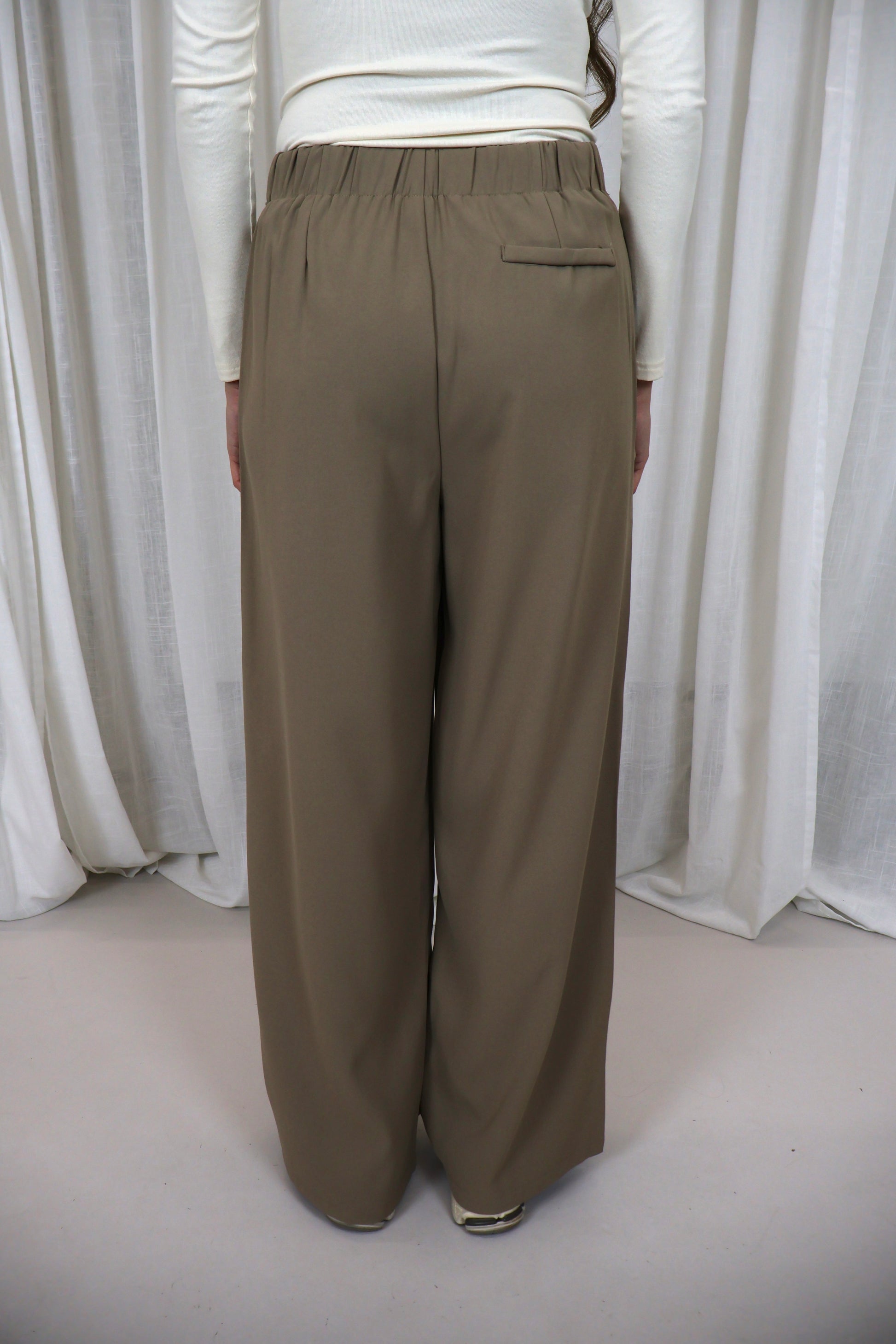 Deze beige pantalon met flap is een modern en stijlvol statement piece met een verfijnde uitstraling. De broek heeft een elegante, wijde fit en is afgewerkt met een unieke flapdetail aan de voorkant, wat zorgt voor een speelse maar chique look. Dankzij de stretchband aan de achterkant zit de pantalon comfortabel en sluit hij mooi aan in de taille. Perfect voor een geklede outfit, maar ook heel mooi te combineren met knitwear of een blazer voor een eigentijdse look.