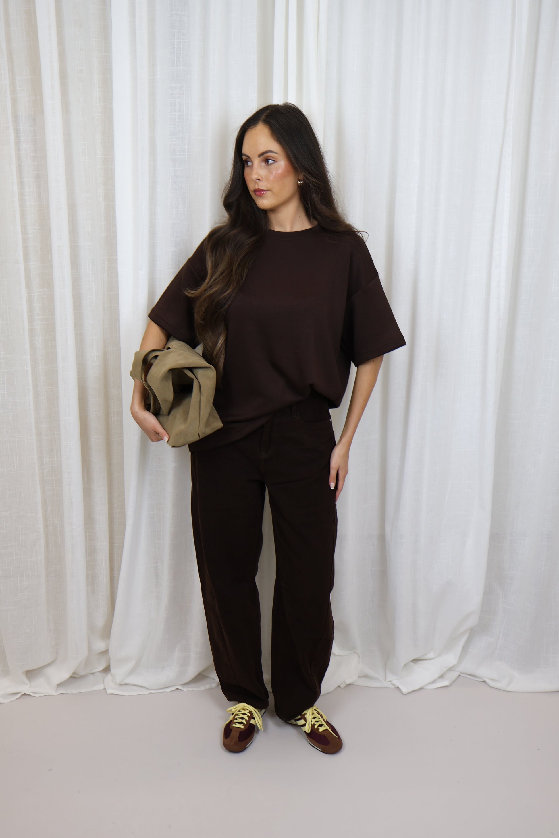 Een oversized T-shirt in een mooie bruine kleur. Deze zachte basic is een echte essential in je garderobe en eindeloos te combineren. Dankzij de relaxte pasvorm en het comfortabele materiaal draag je dit shirt het hele jaar door.