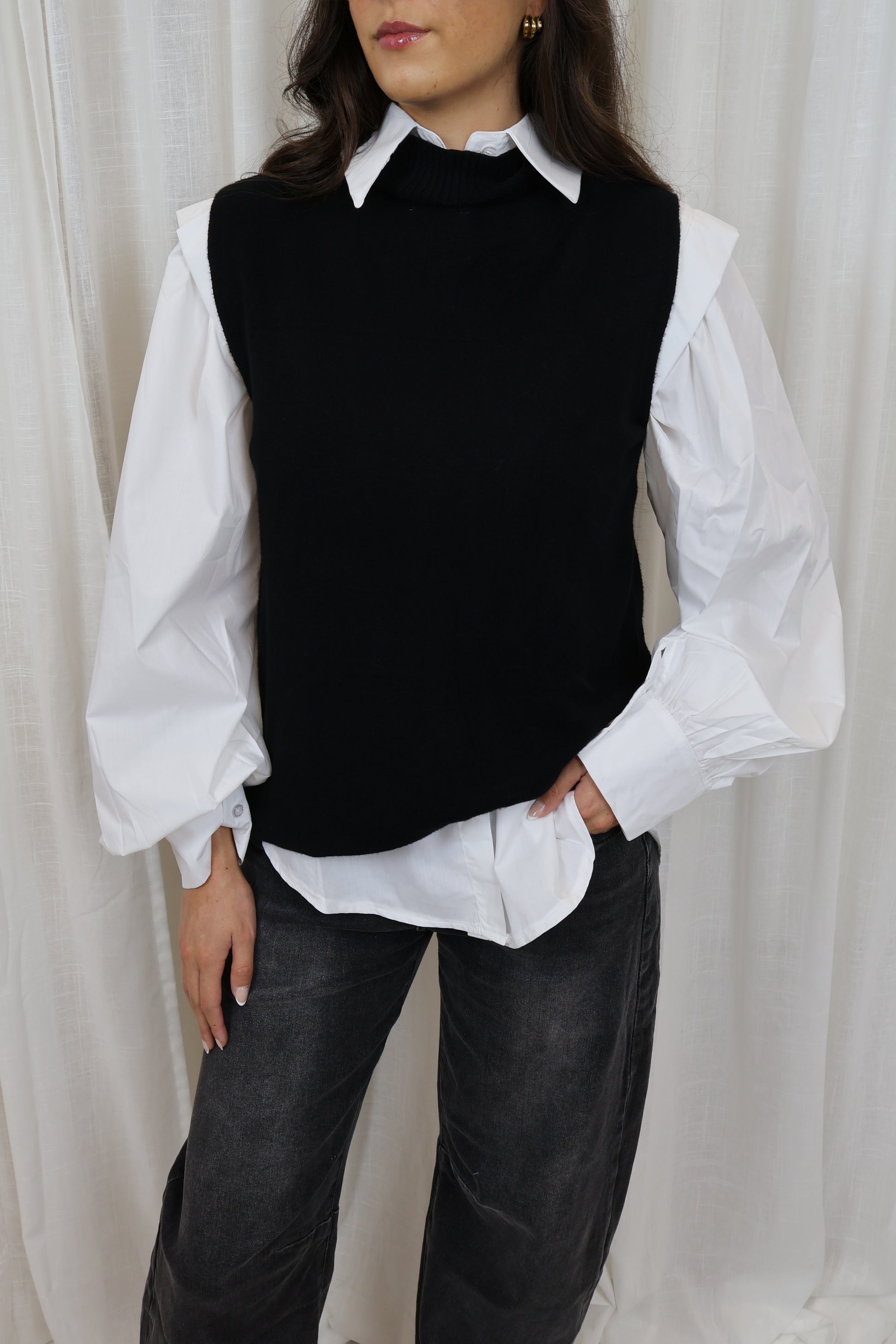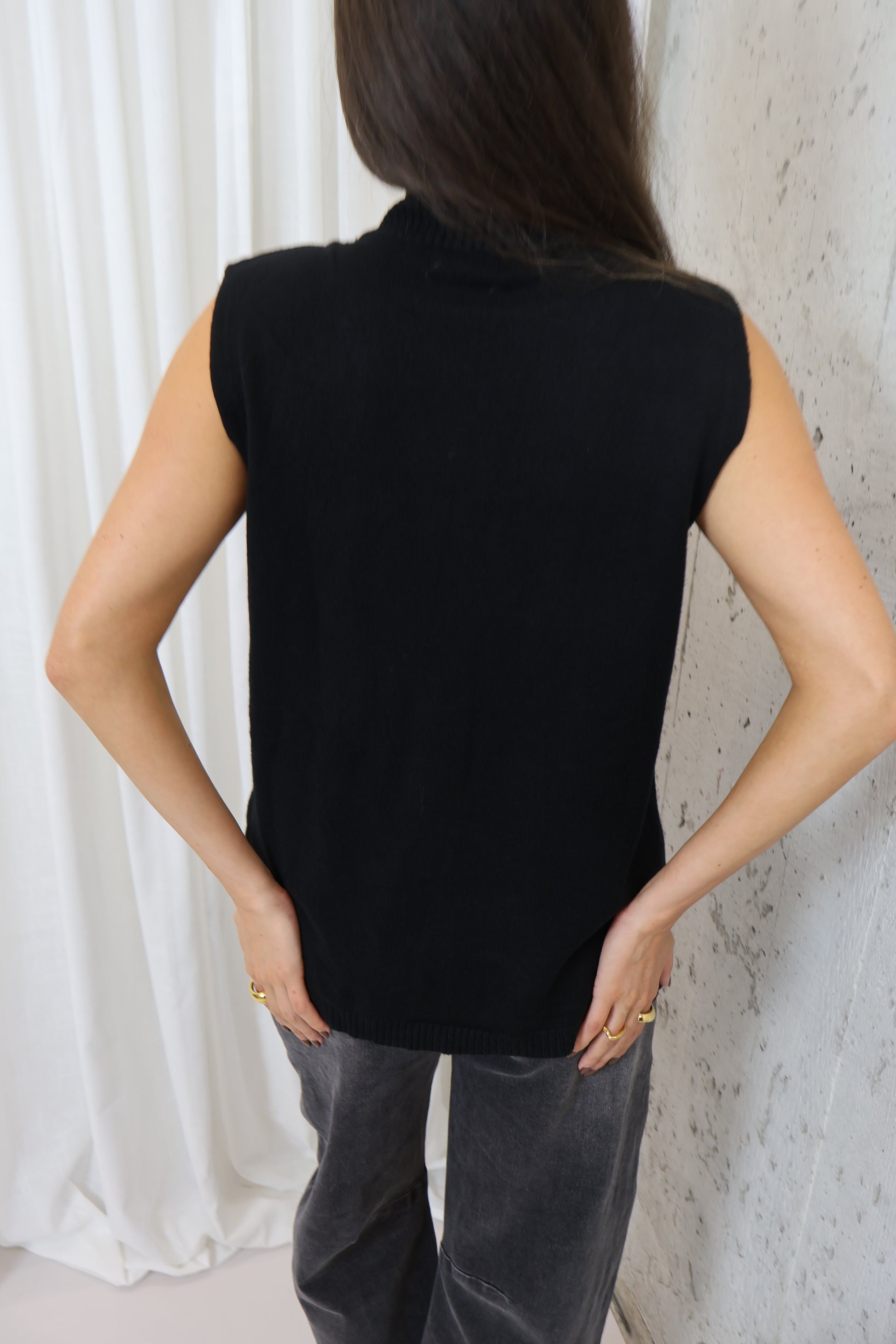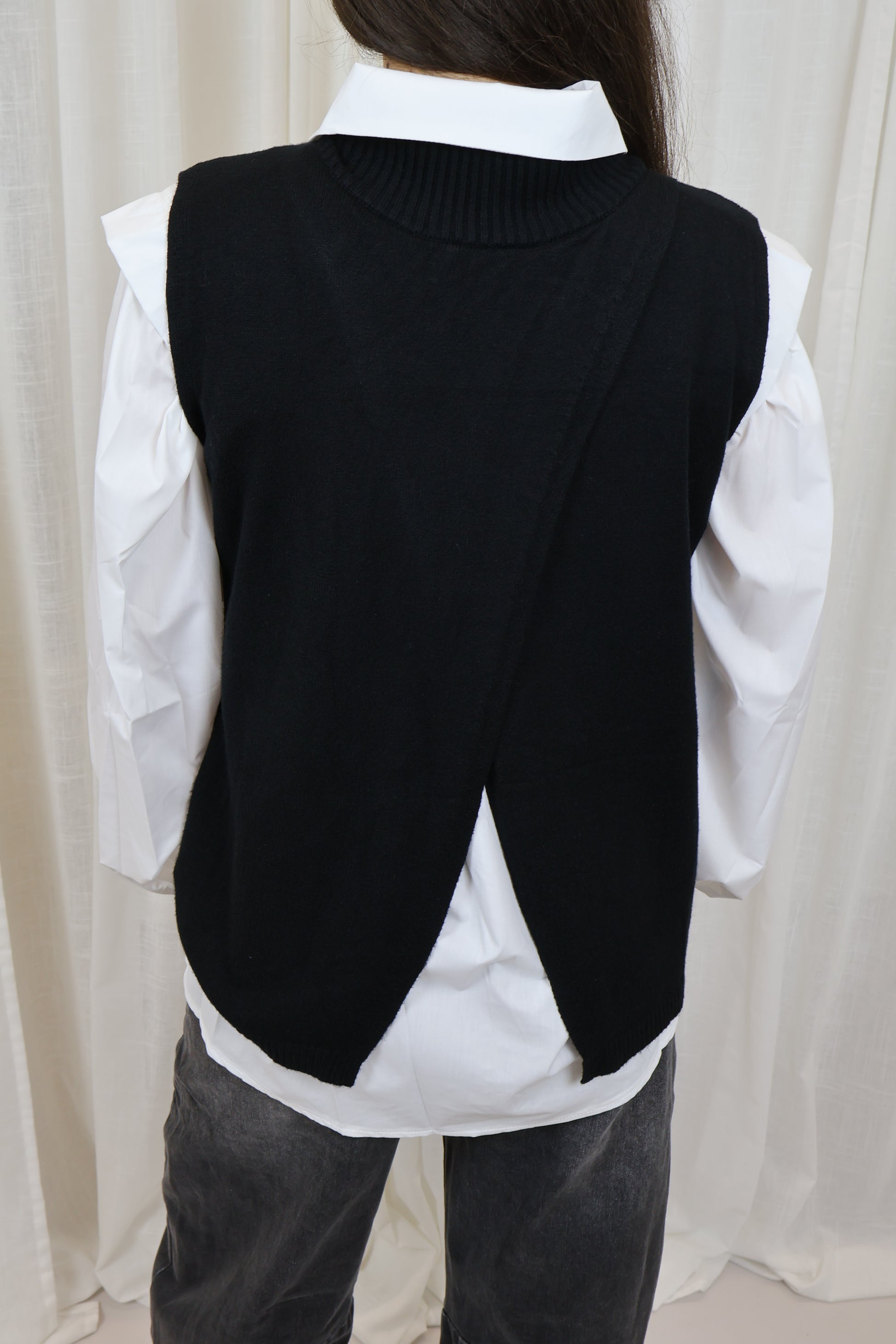 Een gebreide spencer in klassiek zwart. Het mouwloze design met split kan zowel aan de voor- als achterkant gedragen worden, waardoor je de top op meerdere manieren kunt stylen. Perfect om los te dragen of te combineren met een blouse voor een moderne en eigentijdse look.
