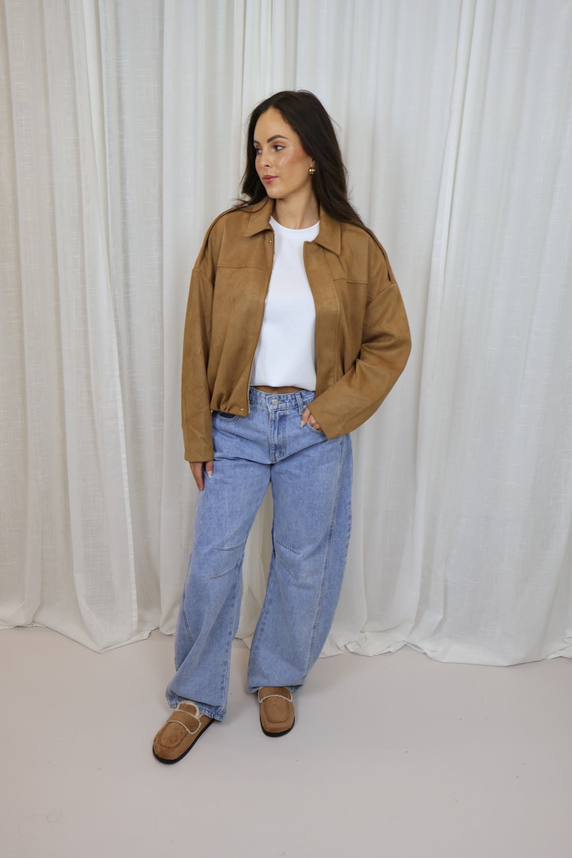 Een stoere en tijdloze suede bomberjas die elke outfit een moderne en casual touch geeft. Dankzij de zachte stof en relaxte fit is dit jasje perfect om dagelijks te dragen en makkelijk te combineren met zowel jeans als pantalons.