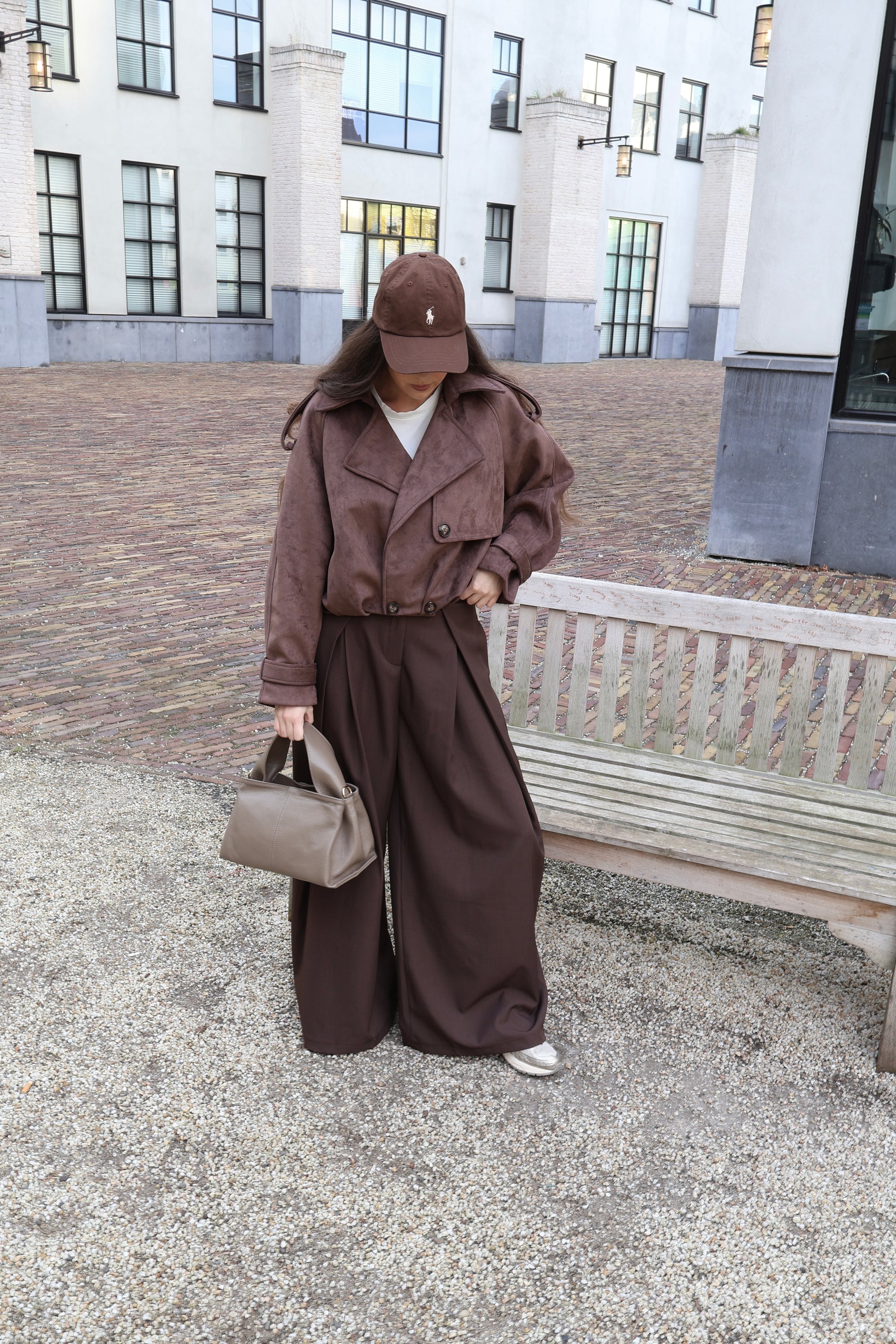Deze donkerbruine suede bomber trenchcoat is een statement piece met een luxe en moderne uitstraling. De combinatie van het bombermodel en trenchcoat-details zorgt voor een unieke, stijlvolle look die moeiteloos chic én casual te dragen is. De suede look geeft de jas een zachte, rijke finish, terwijl de elastische kwaliteit zorgt voor extra comfort en bewegingsvrijheid. Perfect om te dragen over een basic top met een pantalon of juist nonchalant met een jeans voor een effortless everyday outfit.