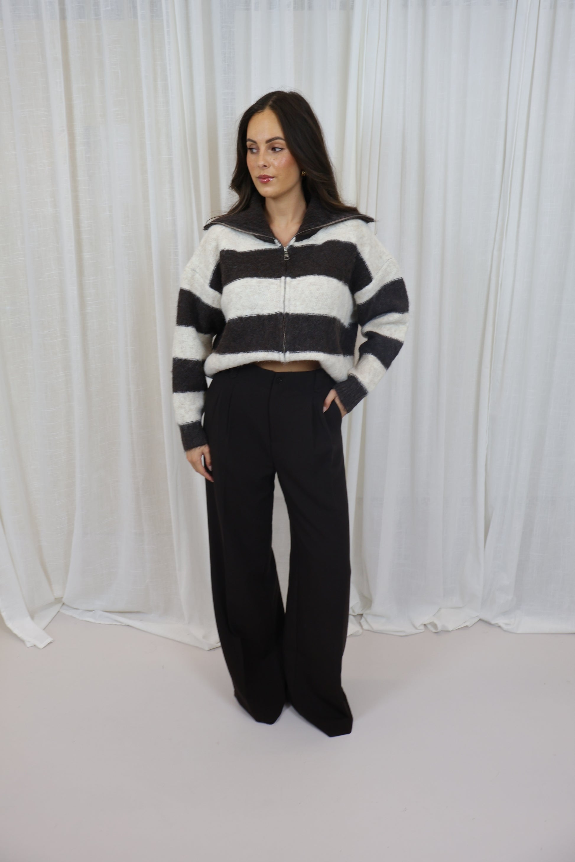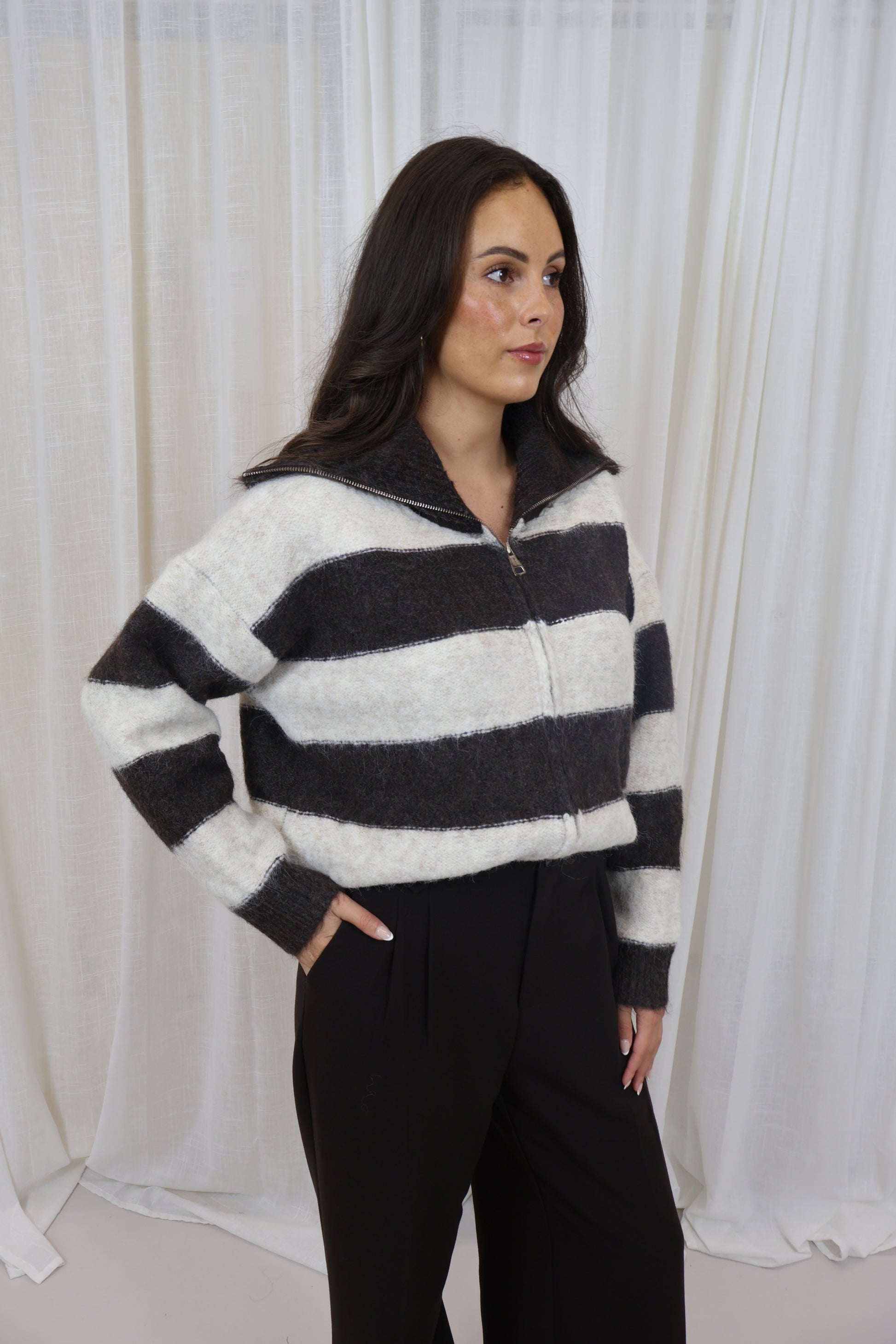 Een gestreepte trui in bruin en crème die je op meerdere manieren kunt dragen. Dankzij de ritssluiting van boven naar beneden kun je de trui zowel open als vest combineren met een shirt eronder, of dicht dragen als warme trui. Een veelzijdig en comfortabel item voor een casual look.